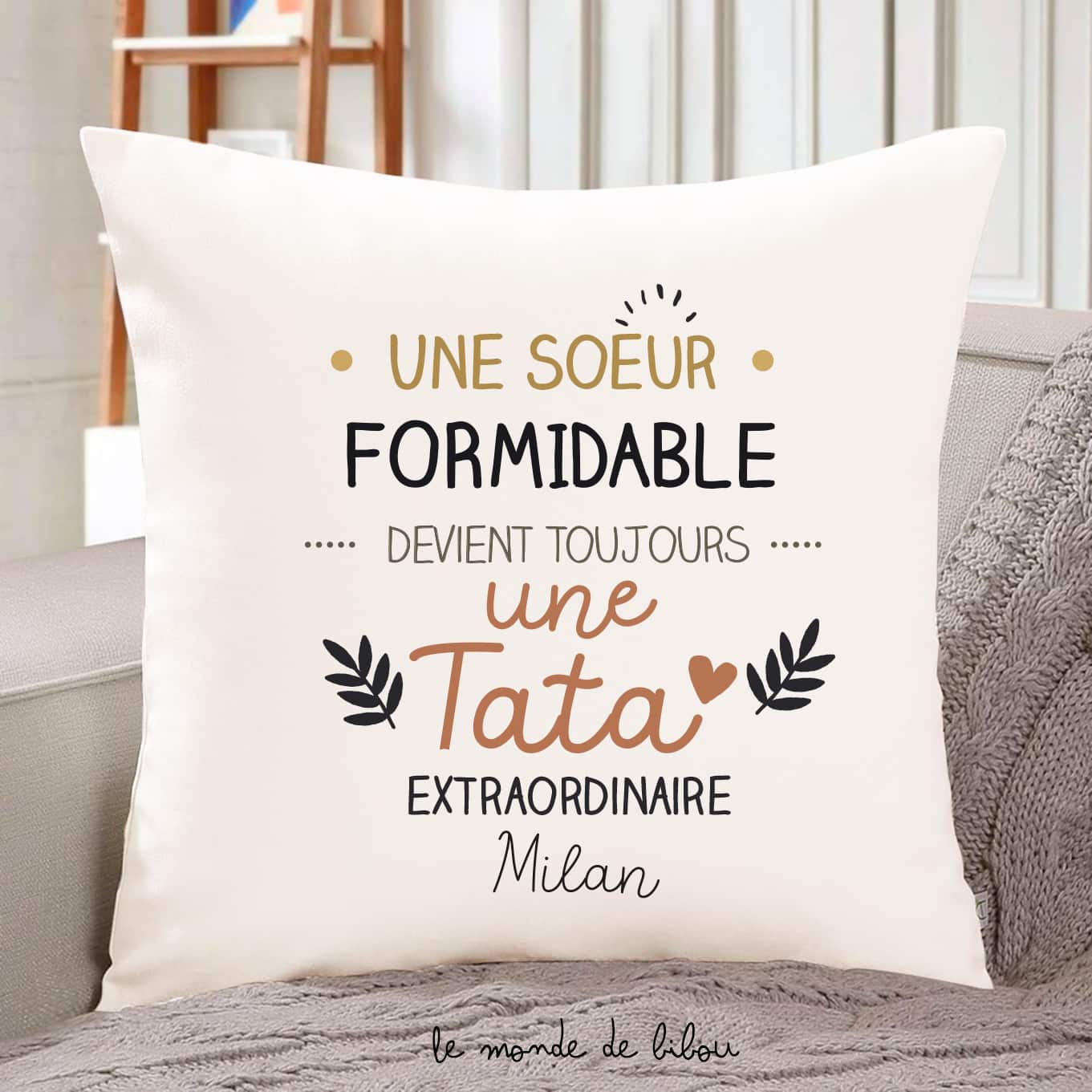 Offrez un cadeau unique avec ce Coussin personnalisé Tata extraordinaire. Ce coussin décoratif est une belle idée de cadeau personnalisé pour dire à sa soeur combien on l’aime et comme on tient à elle. Idéal comme cadeau d’anniversaire, à l’occasion d’une naissance ou comme cadeau de Noël… Et pourquoi pas l’offrir pour annoncer une bonne nouvelle ?