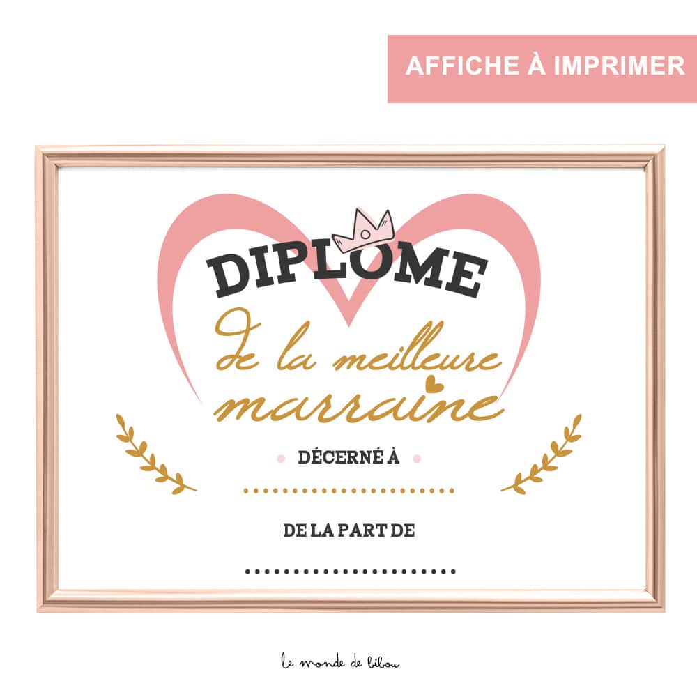 - Texte : « Diplôme de la meilleure marraine. Décerné à espace prévu pour le prénom de la marraine de la part de espace prévu pour prénom du/de la filleul(e)«