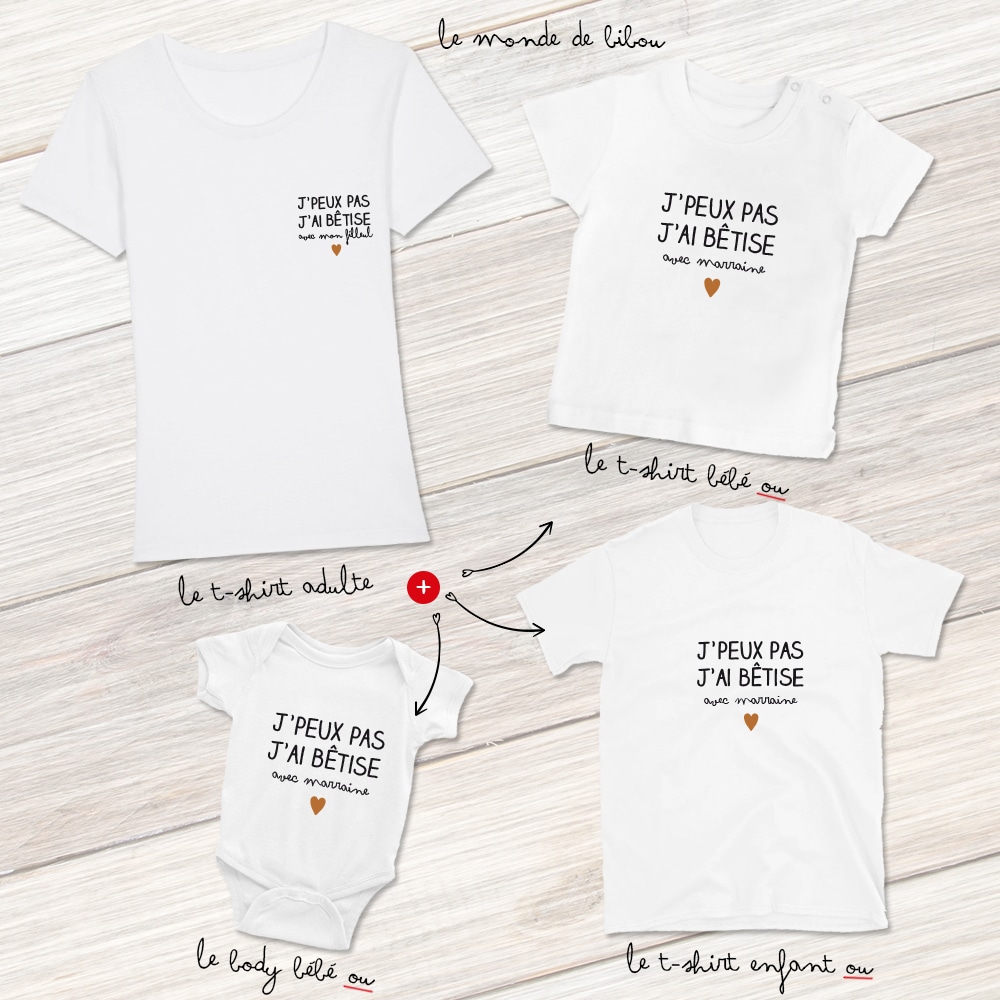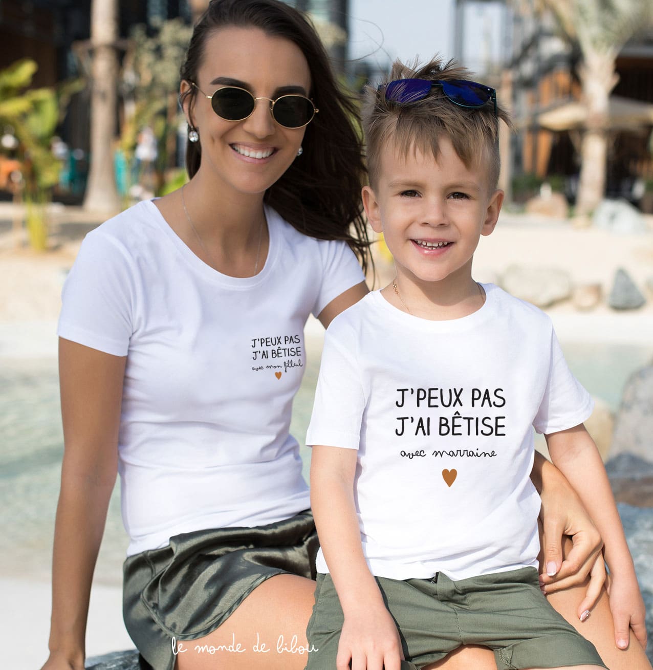 On adore ce Duo Bêtise avec Marraine et Filleul composé d’un t-shirt adulte pour la marraine et d’un t-shirt bébé ou d’un t-shirt enfant ou d’un body pour le ou la filleul(e) ! Coordonnez la marraine et son filleul ou sa filleule avec notre jolie collection matchy matchy !