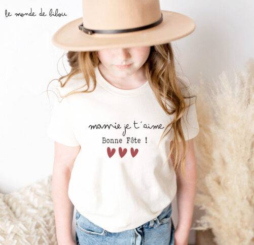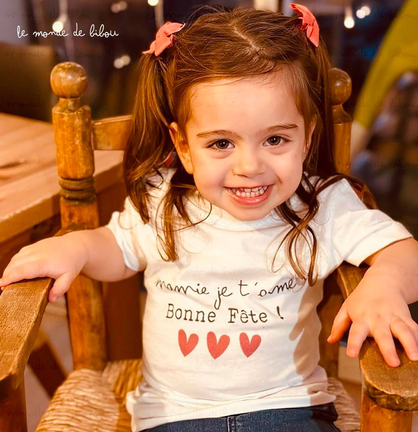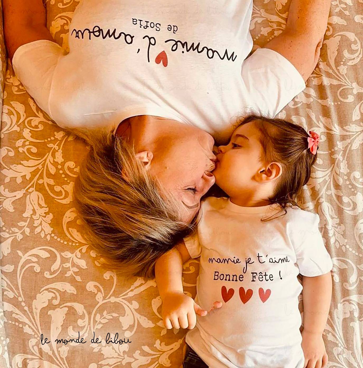 On adore ce Duo Bonne fête Mamie d’amour composé d’un t-shirt adulte pour la mamie et d’un t-shirt bébé ou d’un t-shirt enfant ou d’un body pour le/la petit-enfant ! Soyez coordonnés, Une jolie collection Matchy Matchy ! C’est le petit cadeau idéal pour la fête des grands-mères. Imaginez la tête de mamie en découvrant ses petits-enfants avec notre adorable teeshirt Bonne fête Mamie, je t’aime !