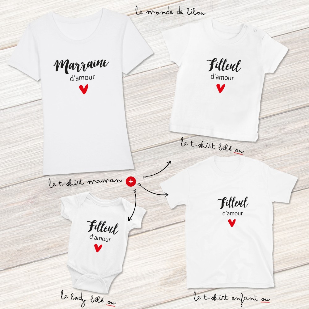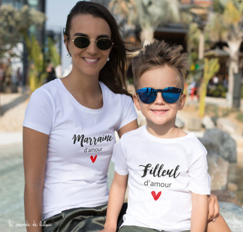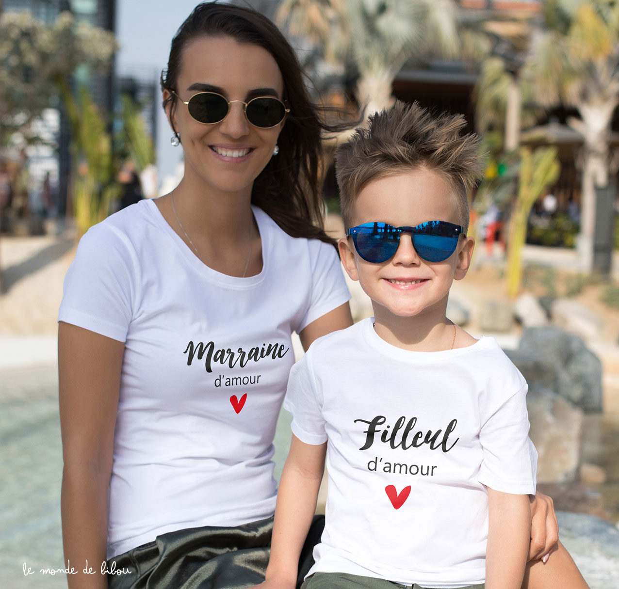 On adore ce Duo Marraine et Filleul d’amour composé d’un t-shirt adulte pour la marraine et d’un t-shirt bébé ou d’un t-shirt enfant ou d’un body pour le filleul ! Coordonnez la marraine et son filleul ou sa filleule avec notre jolie collection matchy matchy !