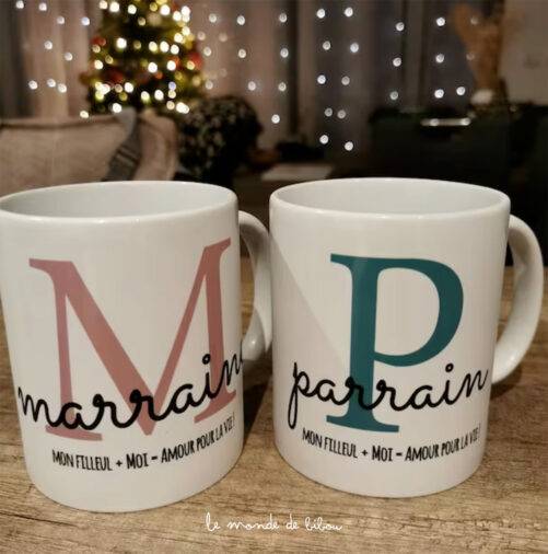 Ce Duo de Mugs Parrain Marraine personnalisables a été réalisé pour un Parrain et une Marraine. C’est une belle attention pour remercier à la fois le parrain et la marraine de votre enfant. Vous pourrez ainsi leur montrer combien vous tenez à eux. C’est aussi un super idée de cadeaux à offrir lors d’un Baptême, d’une Communion, d’un anniversaire, mais aussi pour une naissance ou comme cadeau de Noël…