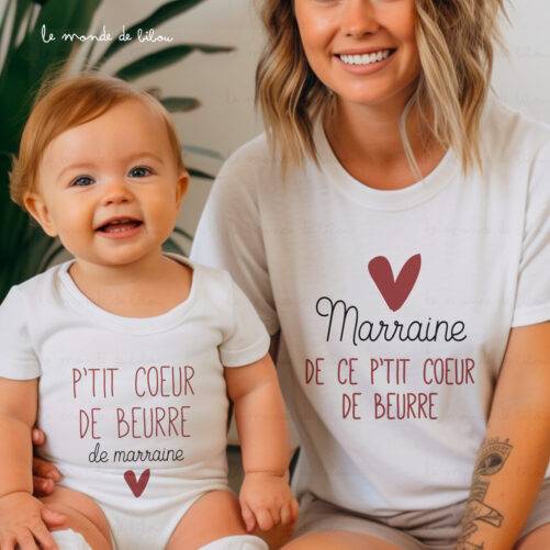 On adore ce Duo P’tit cœur de beurre à sa marraine composé d’un t-shirt adulte pour la marraine ou le parrain et d’un t-shirt bébé ou d’un t-shirt enfant ou d’un body pour le ou la filleul(e) ! Coordonnez la marraine et son filleul ou sa filleule avec notre jolie collection matchy matchy !