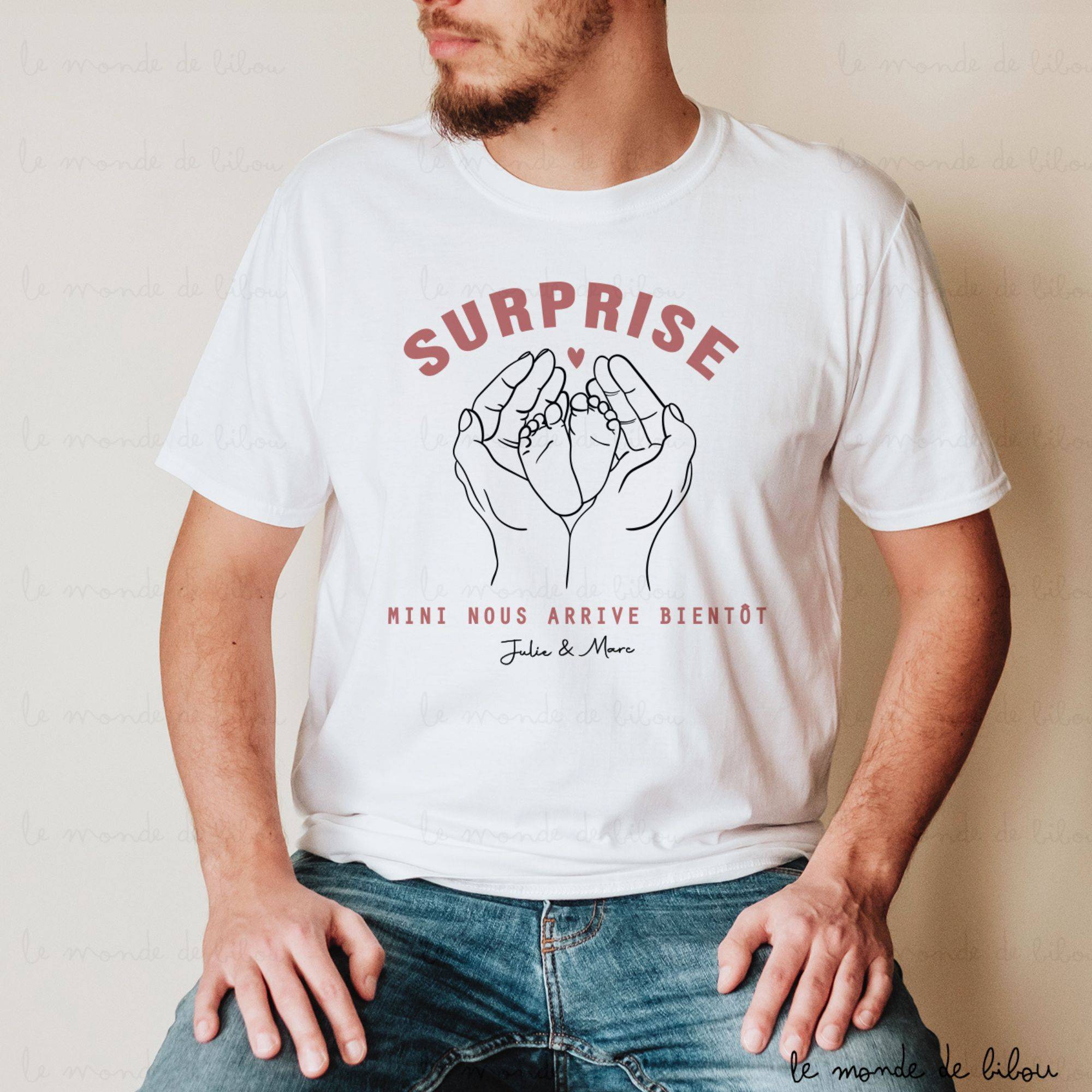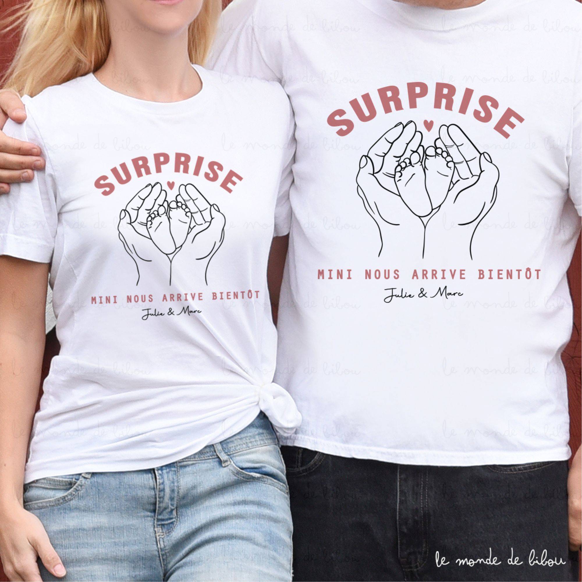 Célébrez la bonne nouvelle avec notre Duo de T-shirts Annonce Naissance personnalisés . Conçu pour les couples qui veulent annoncer l’arrivée du futur bébé de façon originale, ce duo de t-shirts offre une façon unique d’annoncer la nouvelle. Mais encore, les tee-shirts sont personnalisables avec les prénoms des personnes composant le couple ce qui le rend encore plus unique !