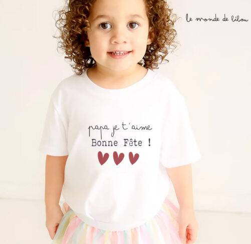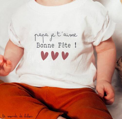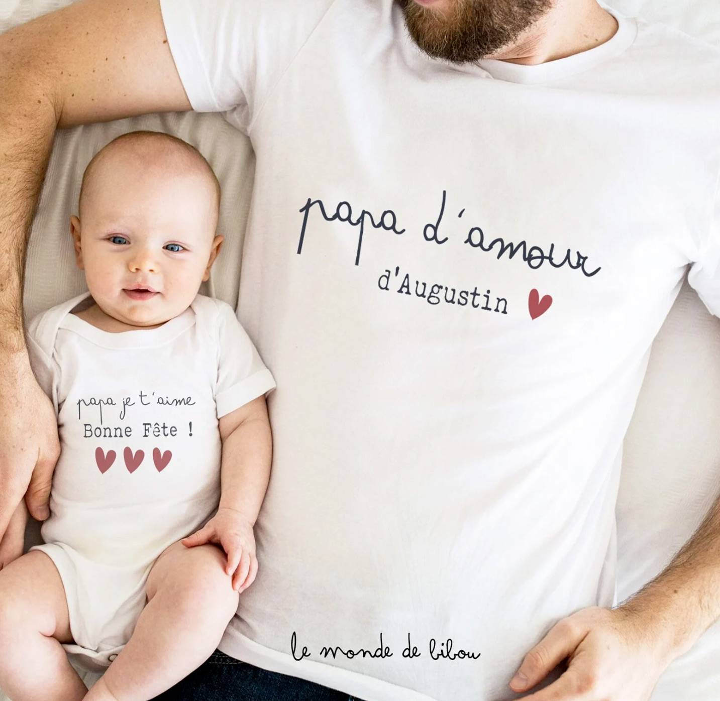 On adore ce Duo T-shirts bonne fête papa d’amour composé d’un t-shirt adulte pour le papa et d’un t-shirt bébé ou d’un t-shirt enfant ou d’un body pour sa fille ou son fils ! Coordonnez vous avec votre enfant et ainsi renforcer votre complicité avec notre jolie collection matchy matchy. C’est une très belle idée cadeau pour la fête des pères ! Papa ne pourra qu’être ému en voyant son enfant dans notre t-shirt ‘bonne fête papa je t’aime ‘