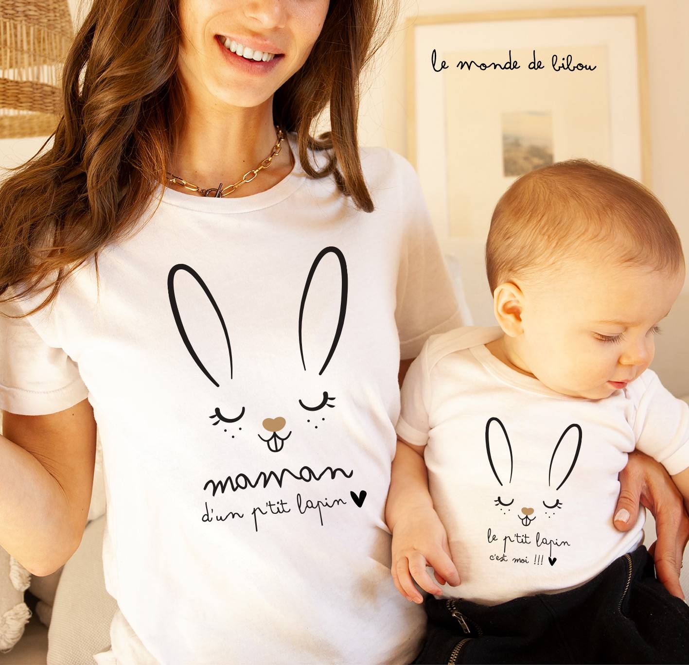 On adore ce Duo T-shirts maman enfant p’tit lapin composé d’un t-shirt adulte femme et d’un t-shirt bébé ou d’un t-shirt enfant ou d’un body ! . Nouveau Existe en version papa !