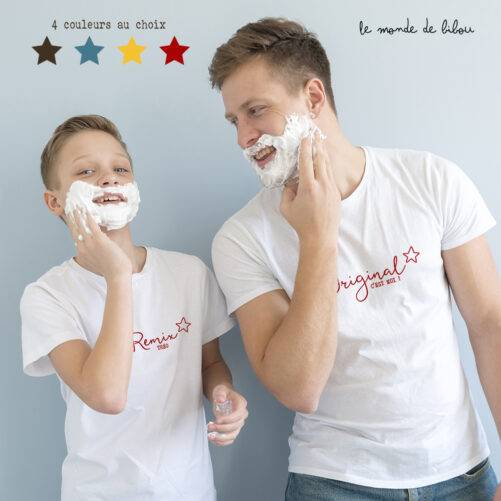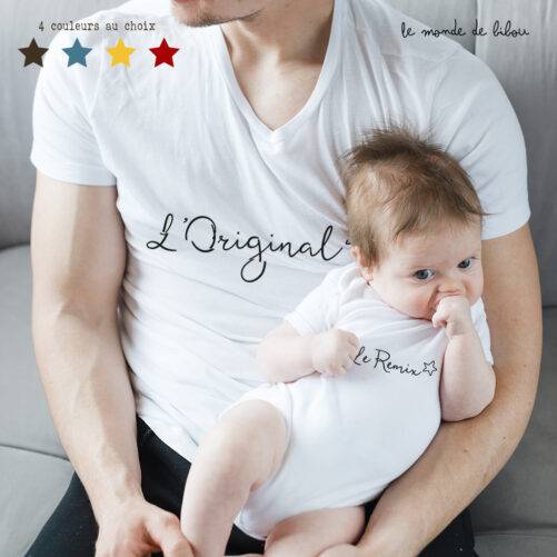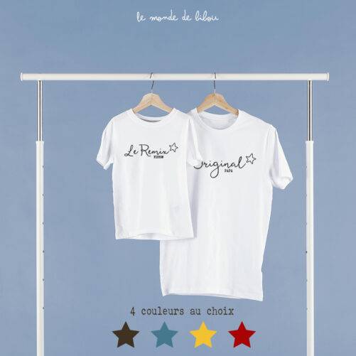 On adore ce Duo T-shirts Original Remix composé d’un t-shirt adulte et d’un t-shirt bébé ou d’un t-shirt enfant ou d’un body ! Un duo disponible en 4 couleurs : jaune d’or, rouge, bleu canyon et chocolat. La personnalisation peut se faire également en ajoutant un prénom ou un petit mot tendre.