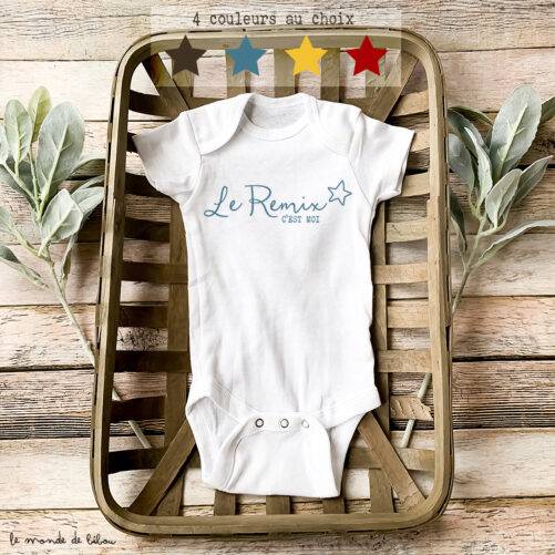 Texte t-shirt/body enfant : « Le Remix » + (par exemple : c’est moi, prénom, fiston chéri, etc…) Soyez coordonnés ! Une jolie collection Matchy Matchy à découvrir.