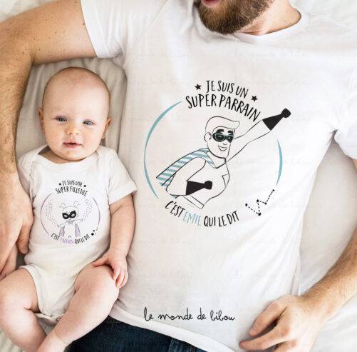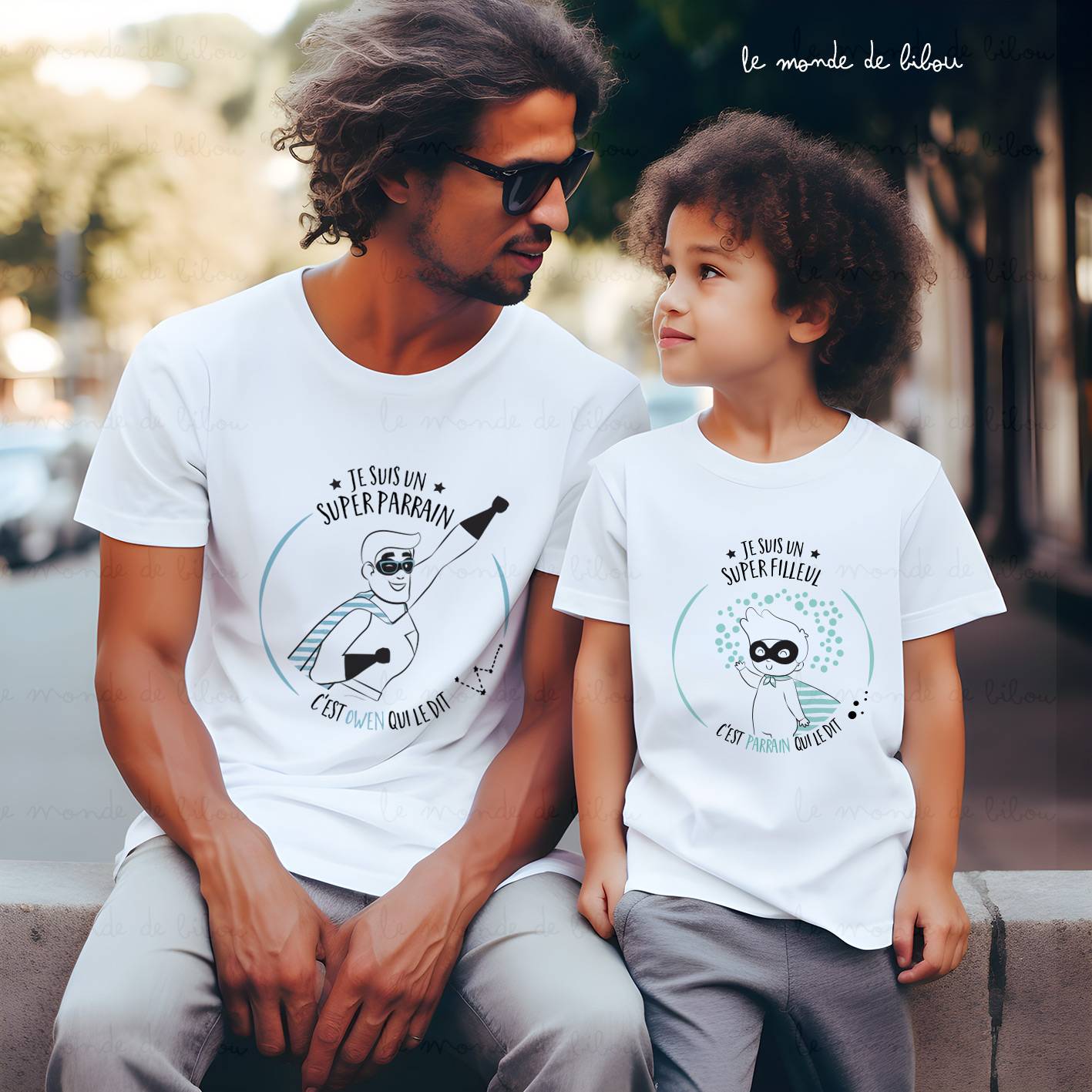 On adore ce Duo T-shirts Parrain Filleul(e) Super héros personnalisés composé d’un t-shirt adulte pour le parrain et d’un t-shirt bébé ou d’un t-shirt enfant ou d’un body pour le ou la filleul(e) ! Des illustrations uniques réalisées dans notre atelier ! Coordonnez le parrain et son filleul(e) et renforcer leur complicité avec notre jolie collection matchy matchy !