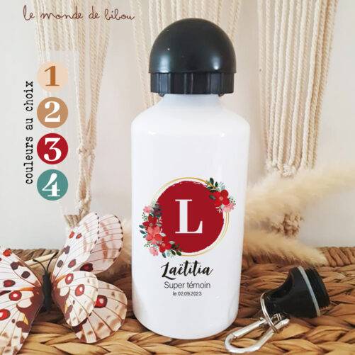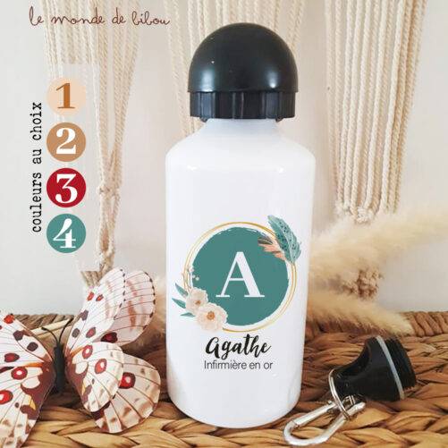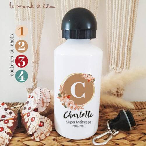 Fini les bouteilles en plastique jetables, vraiment pas écologique, on pense gourde maintenant. Notre Gourde personnalisé Initiale couronne de fleurs est une chouette idée de cadeau personnalisé ! Le revêtement en polymère de la gourde ne s’abîme pas avec le frottement. Les bouteilles en aluminium sont extrêmement résistantes aux chocs ou aux chutes, elles ont aussi une très grande durée de vie.