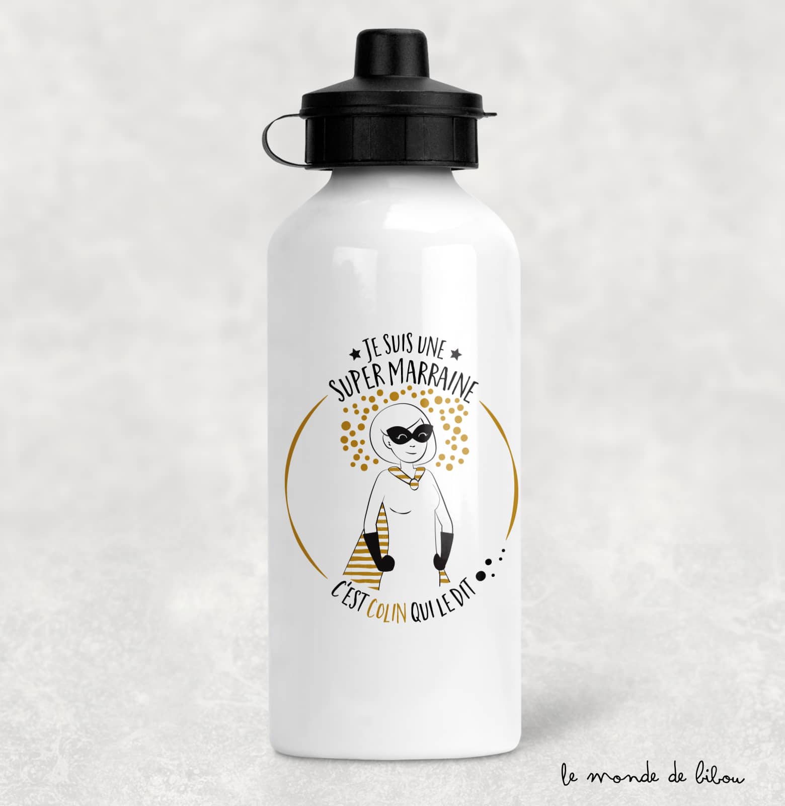 Fini les bouteilles en plastique jetables, vraiment pas écologique, on pense gourde maintenant. Notre Gourde personnalisée Marraine Super héros est une chouette idée de cadeau est une chouette idée de cadeau pour une super marraine !