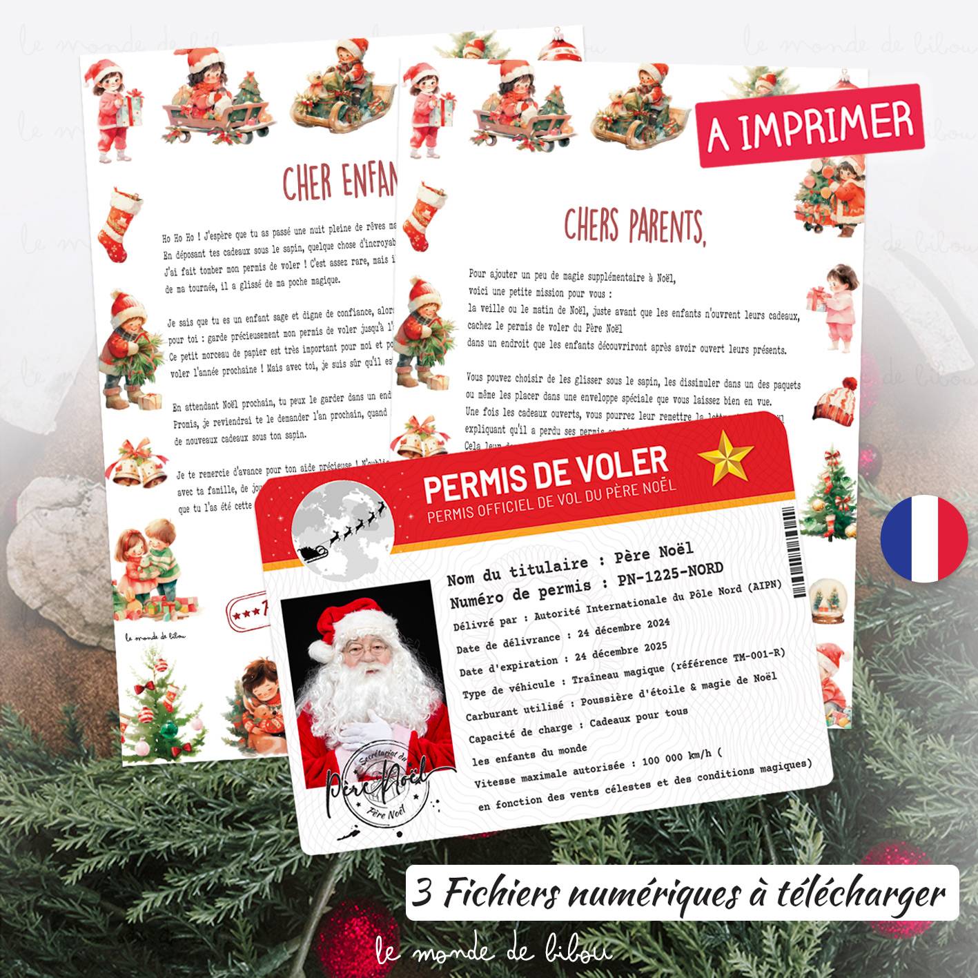 - Lettre pour les parents (Format A4) : Explications détaillées sur le jeu et conseils pour cacher le permis, maintenant ainsi la magie de Noël jusqu’à l’année prochaine.