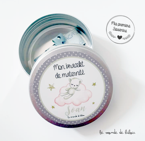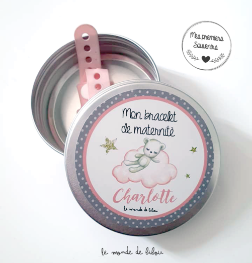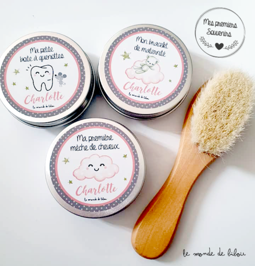 - Textes « Ma première mèche de cheveux – Ma petite boîte à quenottes – Mon bracelet de maternité »