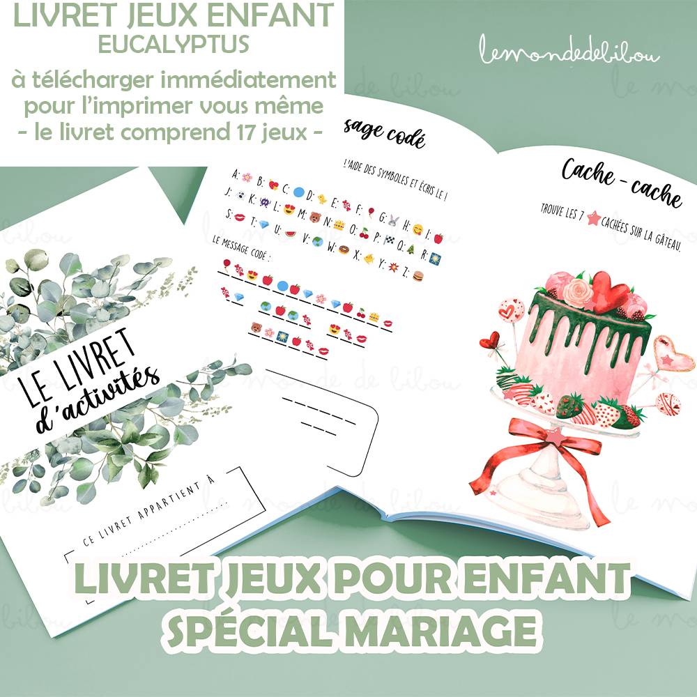 Notre fichier de Livret de Jeux pour Enfants à imprimer vous plaît ? Retrouvez les affiches et pancartes numériques à télécharger sur le même thème Mariage Eucalyptus. Enfin découvrez toutes nos cartes et jeux à gratter demandes, annonces et invitations ici dans notre carterie personnalisée pour tous vos événements heureux.