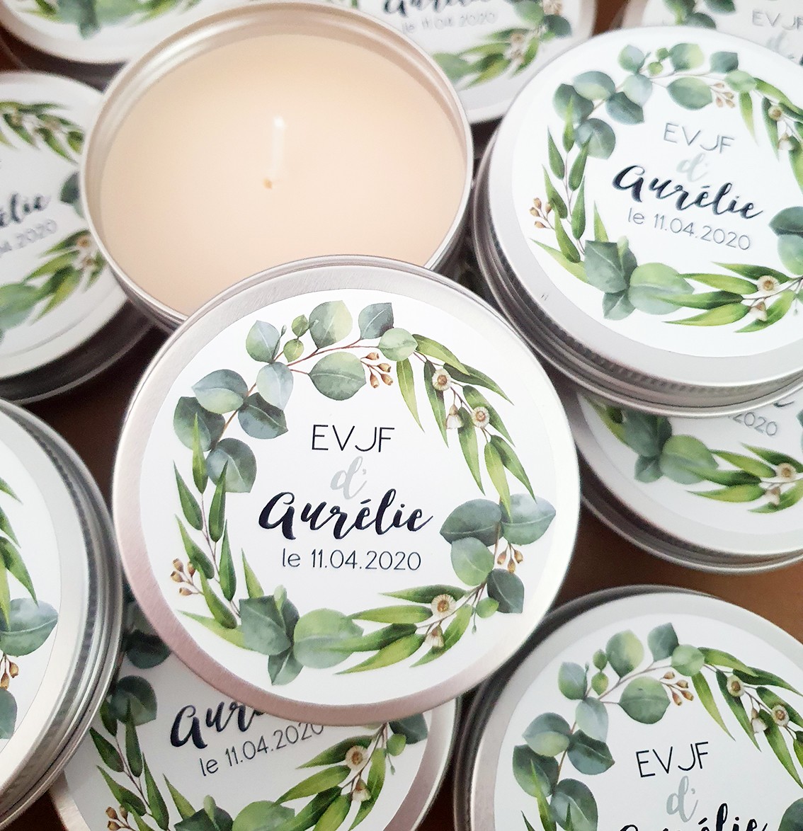 Notre Lot de 10 bougies EVJF Eucalyptus personnalisées est à offrir à toutes les participantes d’un Enterrement de Vie de Jeune Fille.
