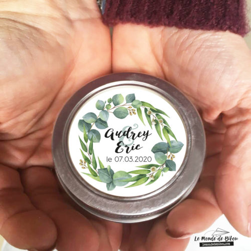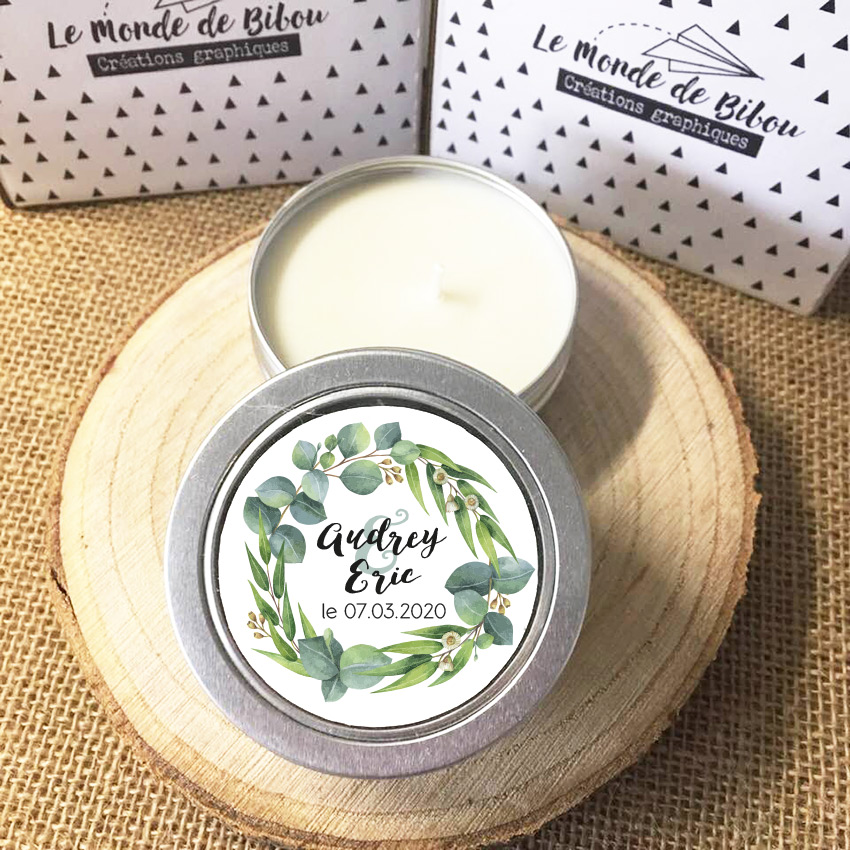 Le Lot de 10 bougies Mariage Couronne d’Eucalyptus, voilà une belle idée cadeau pour vos invités qui change des traditionnelles dragées. Nos jolies bougies personnalisées seront les cadeaux invités idéaux.