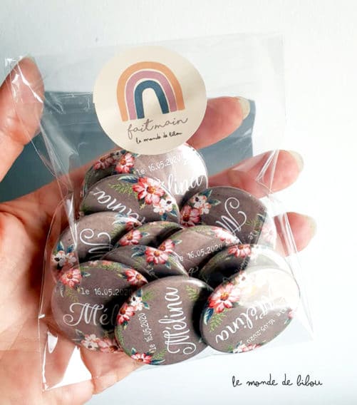 Notre Lot de 12 Badges thème fleurs est joliment décoré dans un esprit bucolique, grâce à ses petites fleurs colorées. Le badge est le petit cadeau à offrir à vos invités lors d’un Baptême, d’une Naissance ou d’une Baby shower. Le Badge s’adapte à tous vos évènements heureux.