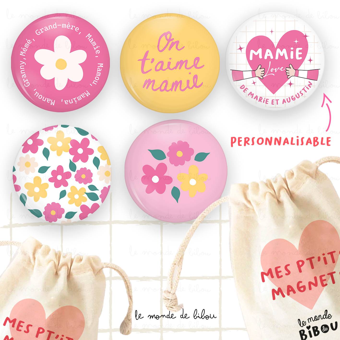 Dans ce lot de 5 Magnets personnalisables pour Mamie, vous trouverez des illustrations florales, des messages doux comme « On t’aime mamie » et « Mamie d’amour pour toute la vie », ainsi qu’un magnet personnalisable avec les prénoms des petits-enfants, pour un cadeau unique et sur mesure. Ce petit détail personnalisé fait toute la différence et transformera ce présent en un souvenir précieux que votre mamie chérira au quotidien.