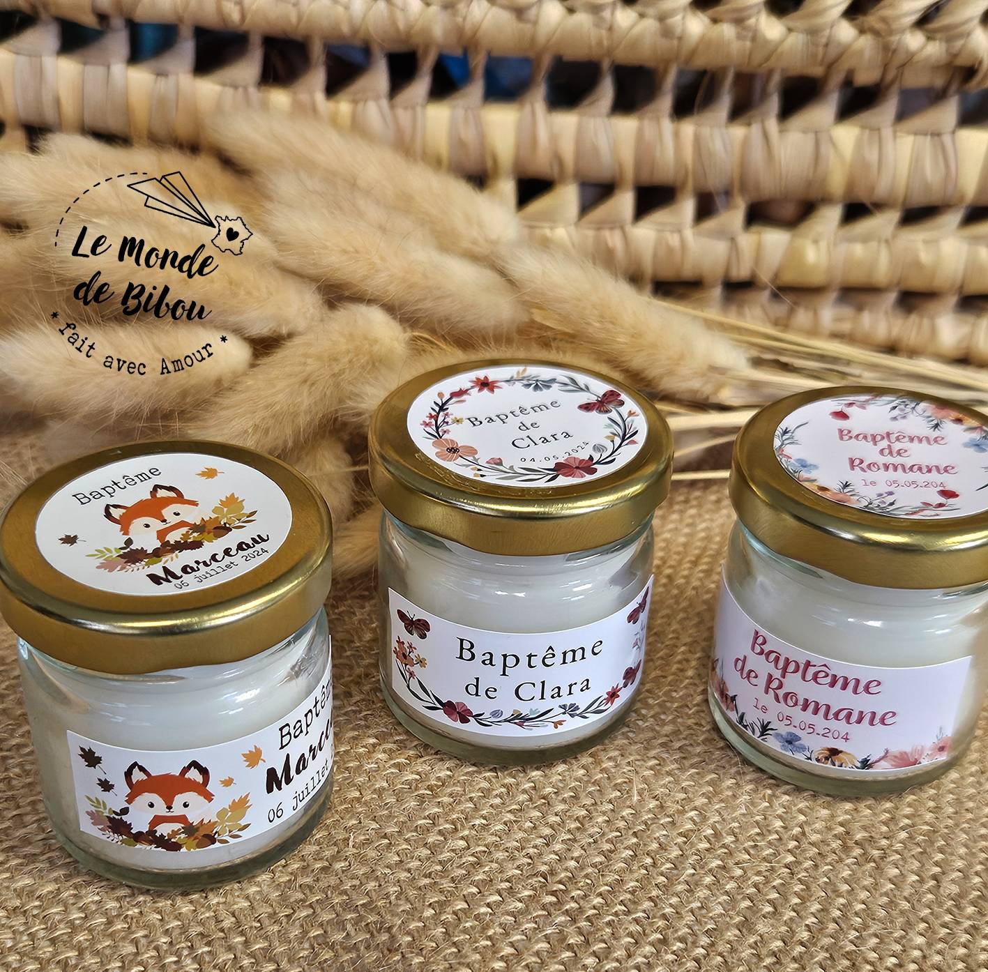 Nos Mini bougies sont parfumées et personnalisées pour votre Baptême et sont élaborées à la main par nos soins à la cire végétale et aux Extraits de Parfum de grasse. Elles sont naturelles, de fabrication française 100% et coulées à la main dans notre atelier.
