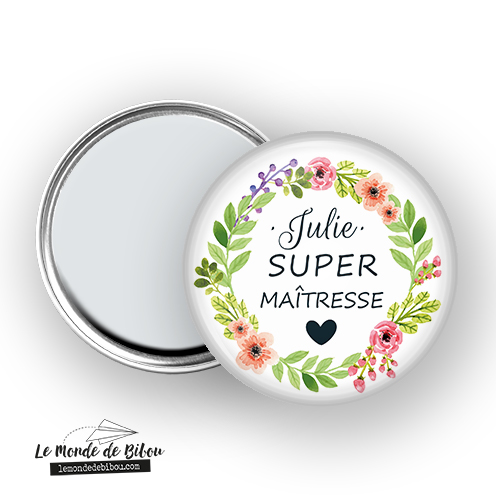 Le Miroir de poche Couronne de fleurs est une belle attention à offrir à la personne de votre choix. Grâce à notre personnalisation à 100%, vous pouvez faire plaisir à une mamie, une nounou, une marraine, etc… Il vous suffit de le noter dans le champ prévu à cet effet (attention votre texte doit être court, 2 ou 3 mots maximum). A titre d’exemple : Louane Super décoratrice – Marie Témoin en or – Clémence Copine au top… Les possibilités sont infinies grâce à ce joli miroir de poche personnalisable.