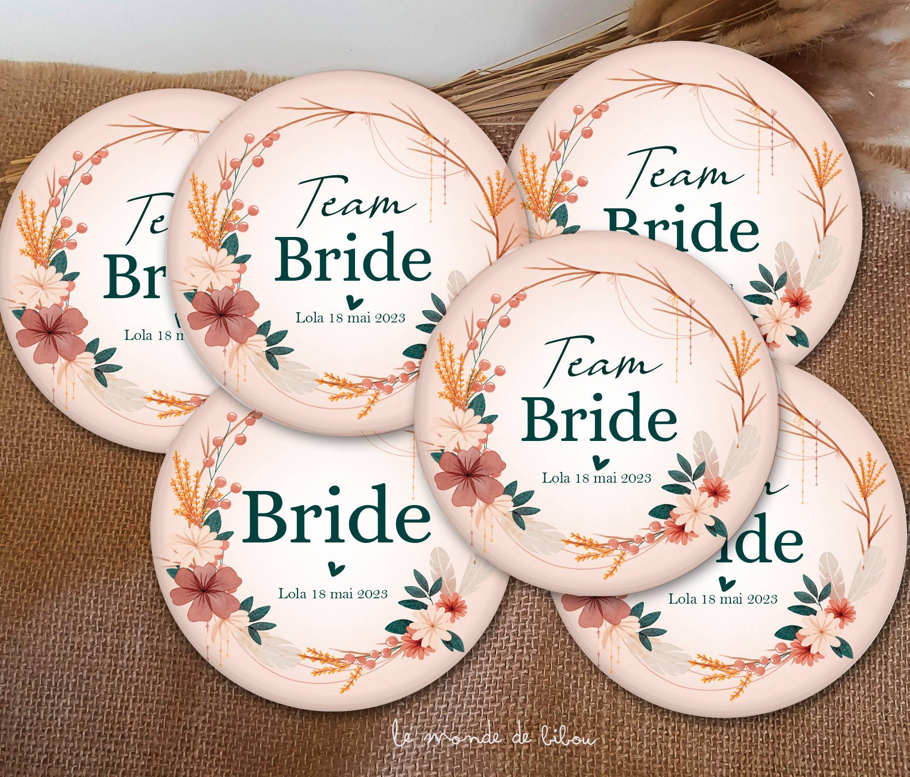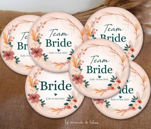 - Texte : “Team bride/Bride + EVJF de PRÉNOM de la future mariée + Date de l’EVJF ou du mariage”