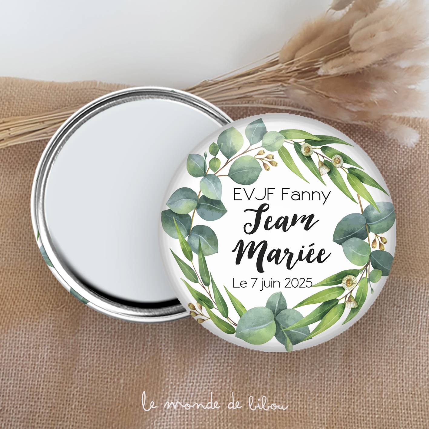 Le Miroir EVJF Couronne eucalyptus est une belle idée de cadeau à offrir aux participantes de votre Enterrement de Vie de Jeune Fille. Il restera, pour chacune d’elles, un beau souvenir aussi joli qu’utile. Vous pouvez être sûr de faire plaisir à toute la Team de la mariée ainsi qu’à la future mariée !