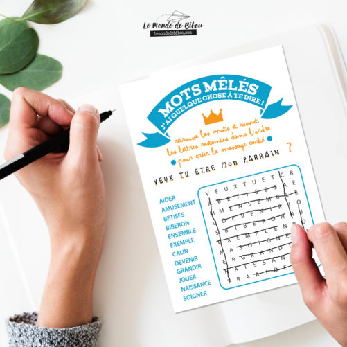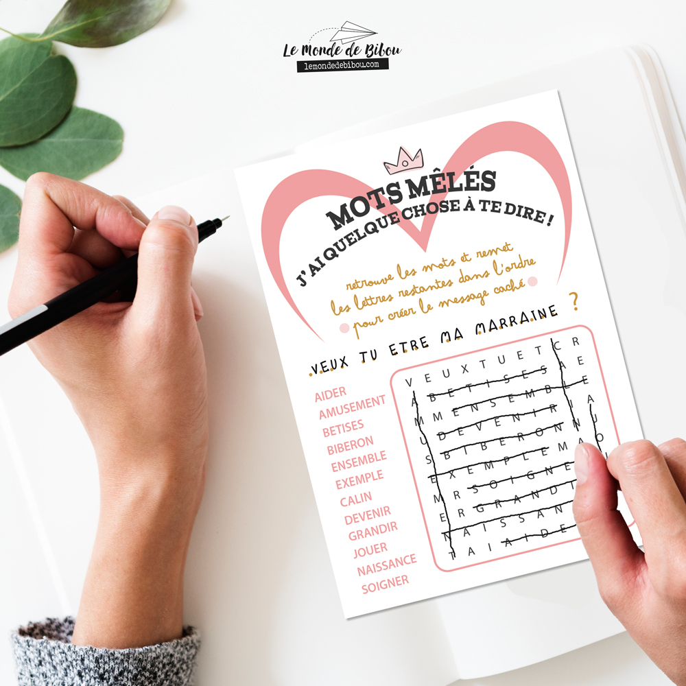 On adore ces Mots mêlés parrain marraine ! Présenté sous forme de Lot de 2 Cartes Jeu Mots Mêlés pour une demande aux futurs Parrain et Marraine, il vous suffit de suivre les instructions du jeu pour former la jolie demande. Pour la marraine : « Veux-tu être ma marraine ? » et pour le parrain : « Veux-tu être mon parrain ? »