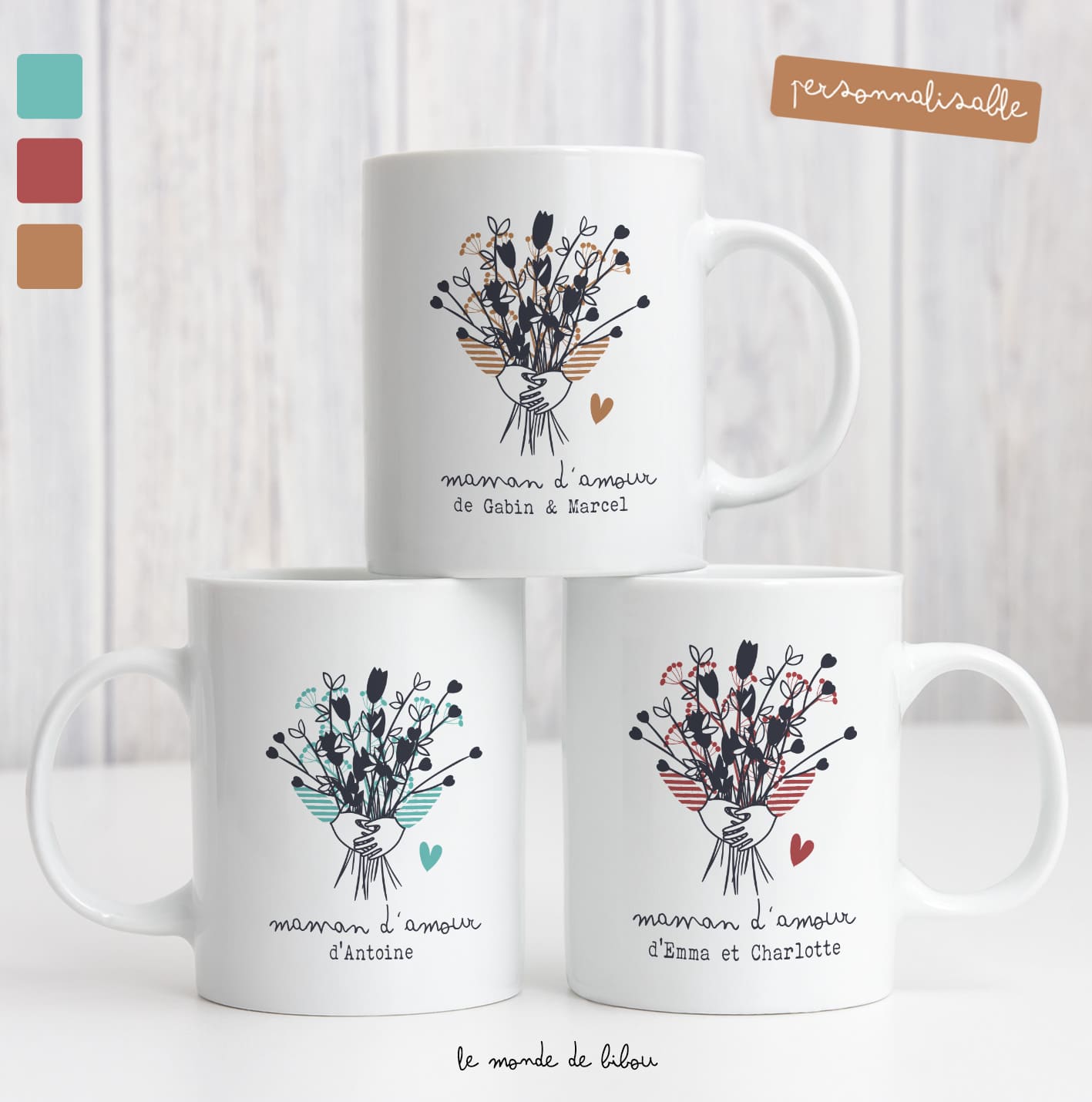 Vous manquez d’idée cadeau personnalisé à offrir à votre maman ? Le Mug Bouquet de fleurs pour maman est une belle idée de cadeau pour dire à sa mère combien elle compte pour nous. Idéal pour célébrer la fête des mères, pour un anniversaire, une naissance ou comme cadeau de Noël… La Tasse est un joli cadeau personnalisable au(x) prénom(s) du ou des enfant(s), en plus nous vous proposons 3 coloris au choix (Turquoise, Groseille ou Caramel) !