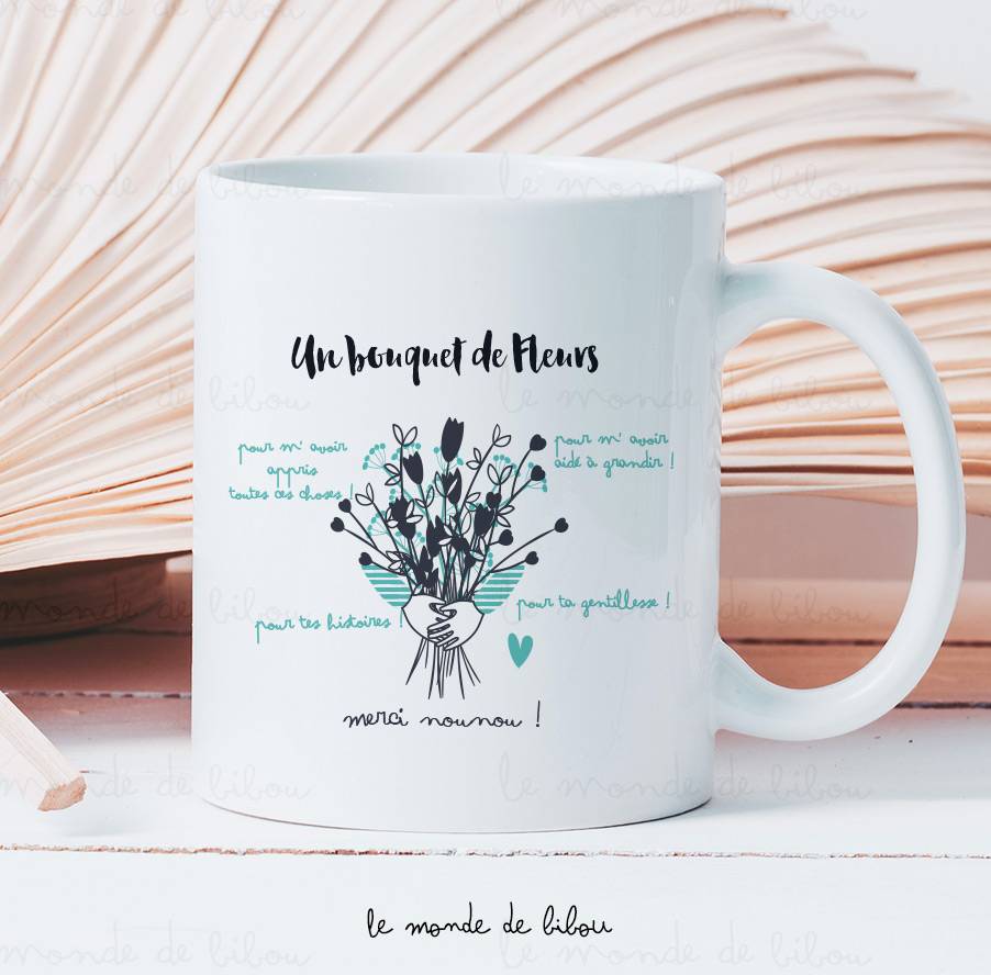 Vous souhaitez offrir un petit cadeau personnalisé à la maîtresse de votre enfant, ou encore remercier sa nounou ? Nous vous proposons ce Mug Bouquet de fleurs Remerciement, une belle attention aussi jolie qu’utile pour remercier la personne qui a pris soin de votre enfant. Un cadeau personnalisé à offrir en fin d’année scolaire ou pourquoi pas comme cadeau de Noël nounou personnalisé.