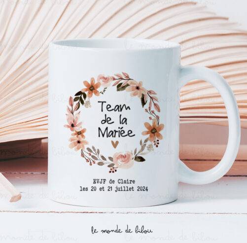 Offrez un cadeau unique aux participantes de l’Enterrement de Vie de Jeune Fille avec ce Mug EVJF Couronne fleurs Boho. C’est une jolie façon qui permettra de garder un joli souvenir de cet événement heureux et qui trouvera rapidement une place dans la vie quotidienne.