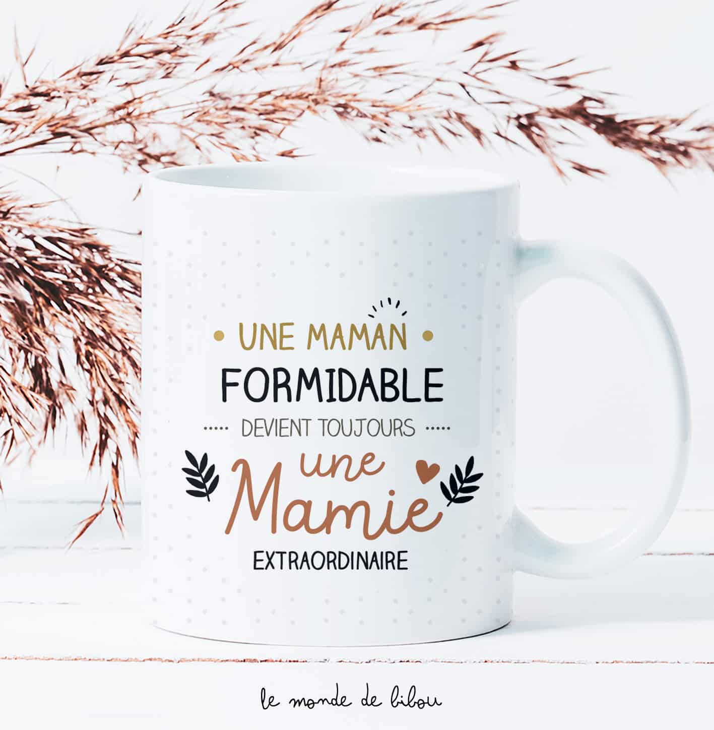 - Texte recto : » Une merveilleuse maman devient toujours une mamie extraordinaire – PRÉNOM(S) du ou des petits enfants » au verso du mug