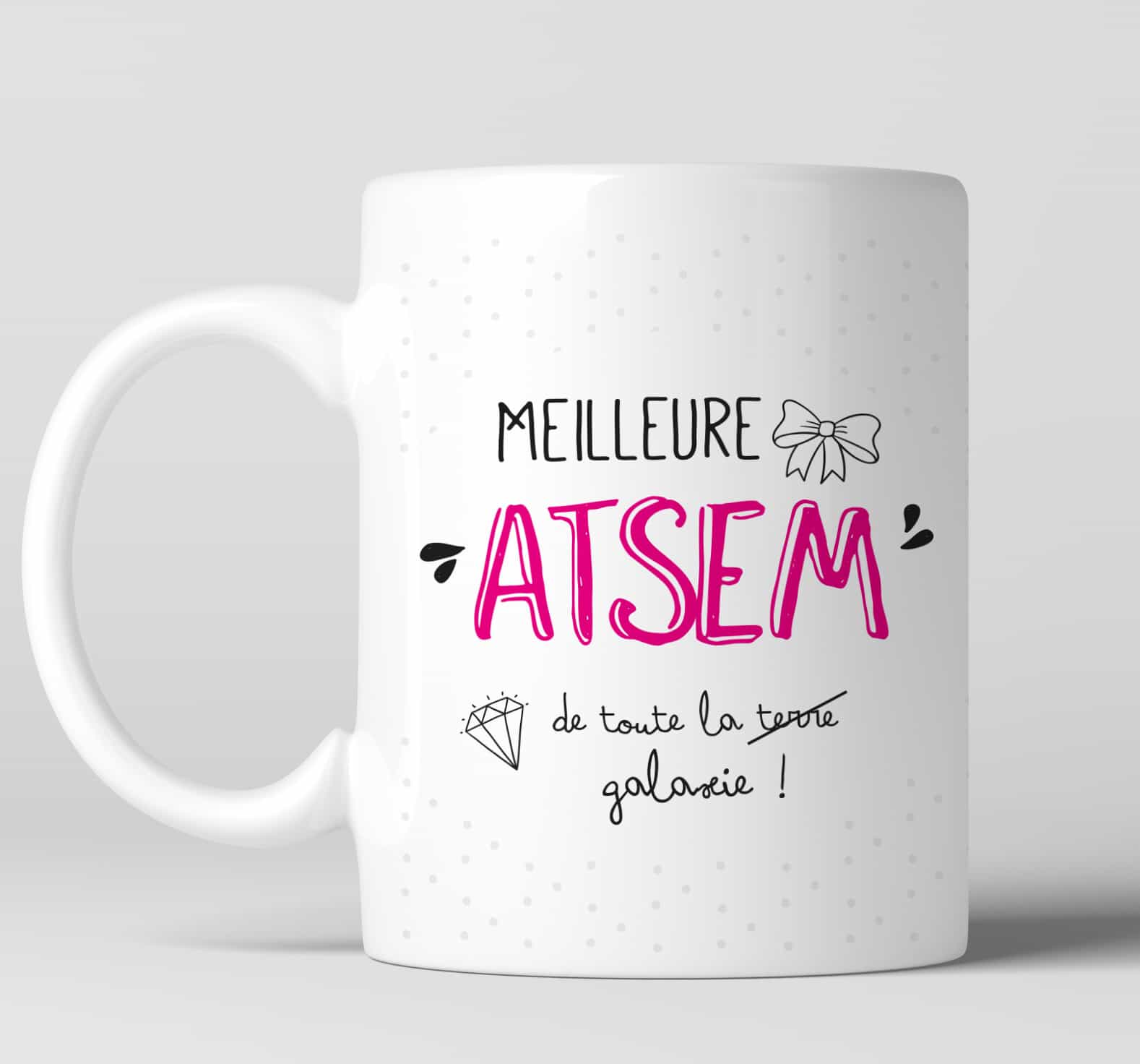 Ce mug personnalisable pour LA meilleure Atsem est une belle attention pour remercier celle (ou celui) de votre enfant. C’est le cadeau idéal à offrir en fin d’année scolaire, pour un anniversaire ou pourquoi pas comme cadeau de Noël.