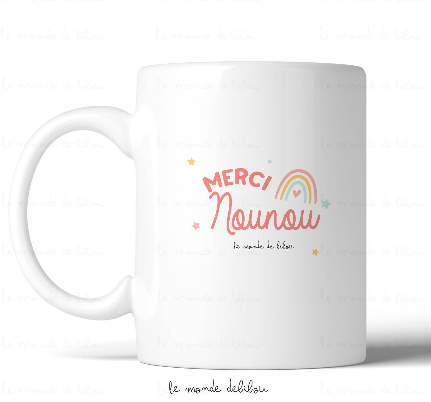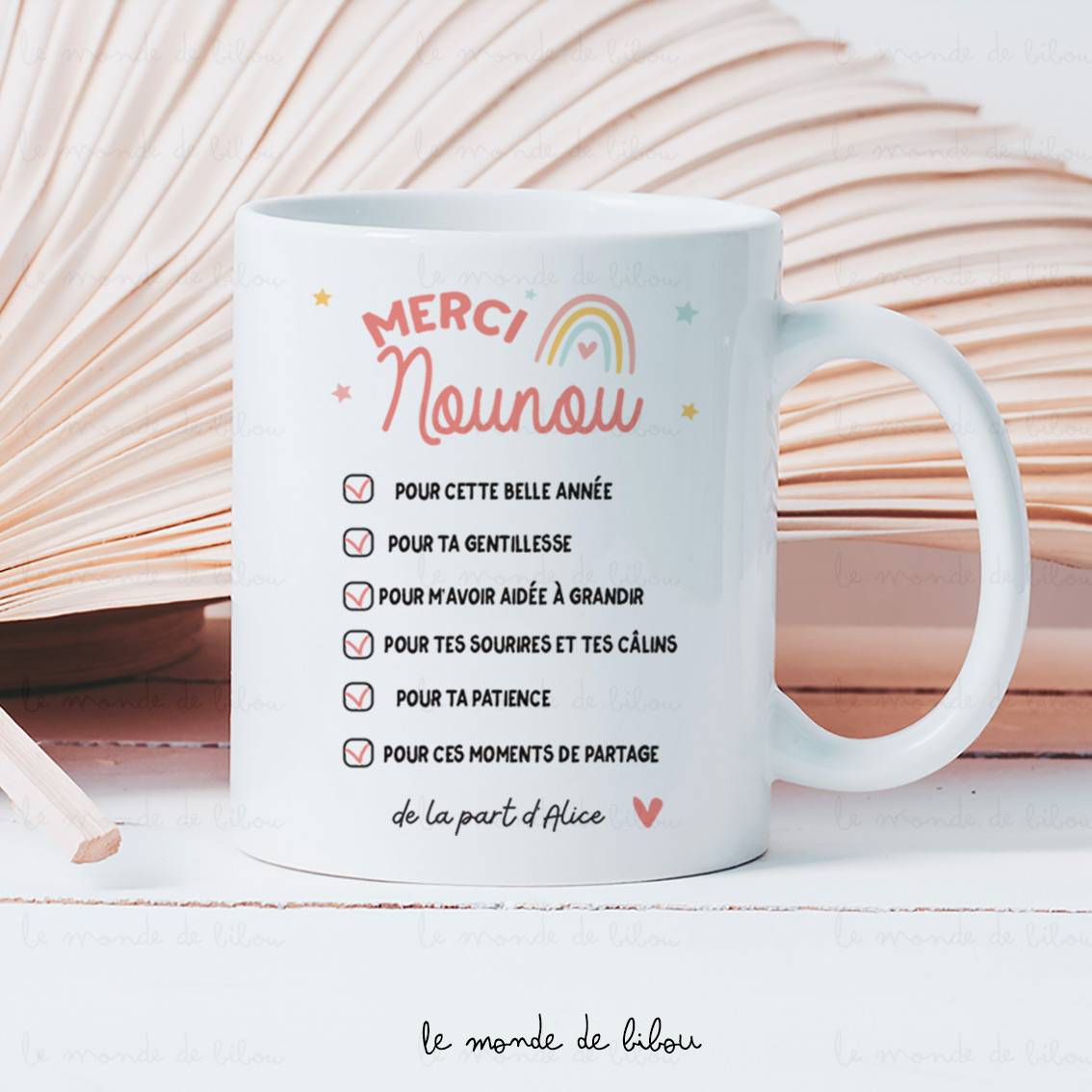 On adore ce mug personnalisable Merci nounou . La personne qui accompagne votre enfant tout au long de l’année ne pourra qu’être touchée par votre cadeau personnalisé. Son texte est un résumé de l’année passée avec votre petit. C’est un joli cadeau pour lui dire au revoir, pour lui souhaiter la fête des nounous le 19 novembre ou pour la remercier pendant les fêtes de Noël.