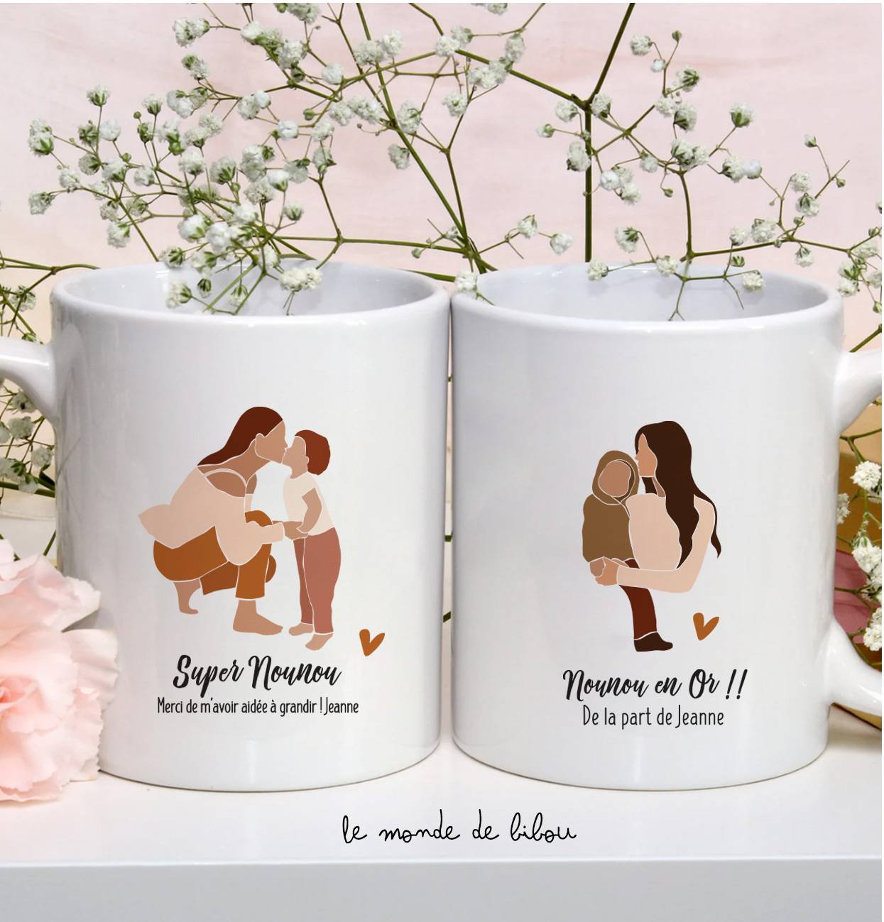 Notre Mug Nounou personnalisé vous plaît ? Retrouvez tous nos cadeaux personnalisés pour Maître, Maîtresse, Atsem, AVS et Nounou (mugs, sacs, goodies et cartes, etc…) dans la boutique. Enfin, retrouvez tous nos mugs personnalisés, à offrir à qui vous voulez et pour toutes les occasions.