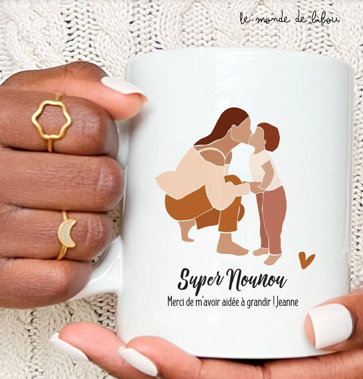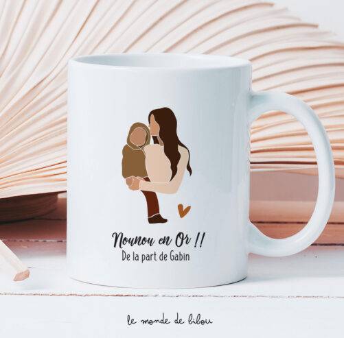 Le Mug Nounou personnalisé pour une nounou est une belle attention pour remercier l’assistante maternelle de votre enfant. C’est le cadeau idéal à offrir pour la fête des nounous le 19 novembre, en fin d’année scolaire, pour un anniversaire ou pourquoi pas comme cadeau de Noël. Cette tasse cadeau personnalisée ne pourra que faire plaisir à la nounou qui va la recevoir.