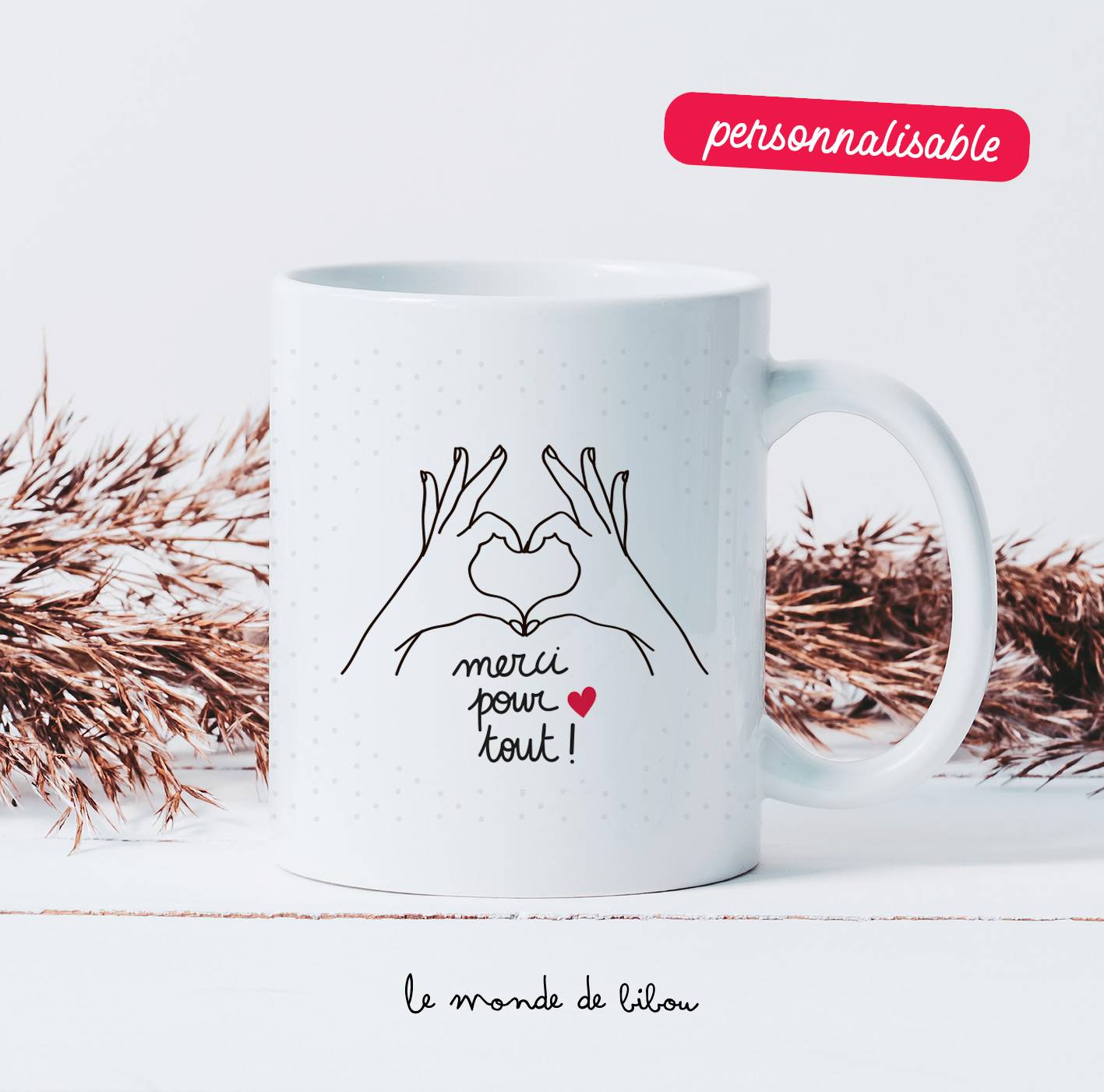 Cette jolie tasse personnalisable pour dire merci est le cadeau idéal à offrir en fin d’année scolaire, pour un anniversaire ou pourquoi pas comme cadeau de Noël, car chez le Monde de Bibou on sait bien que ça n’est pas toujours évident de trouver un petit cadeau original et personnalisé à offrir.