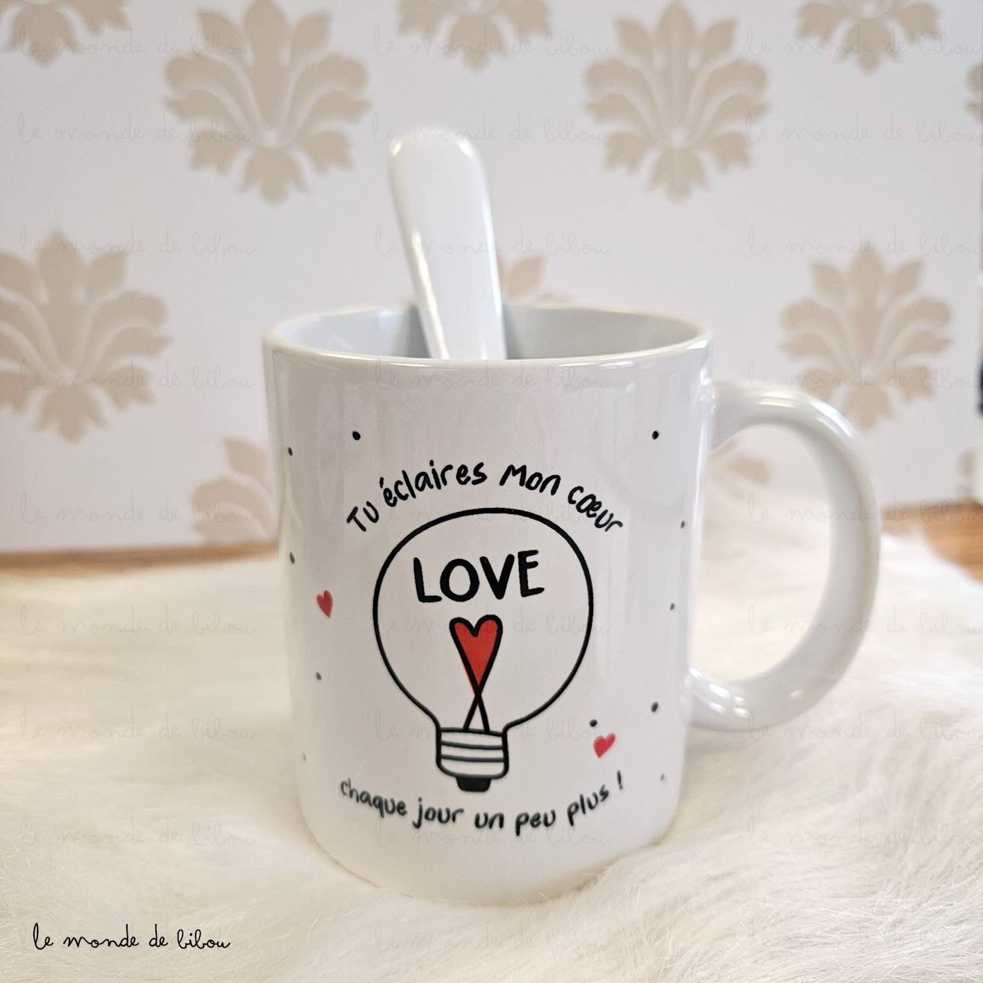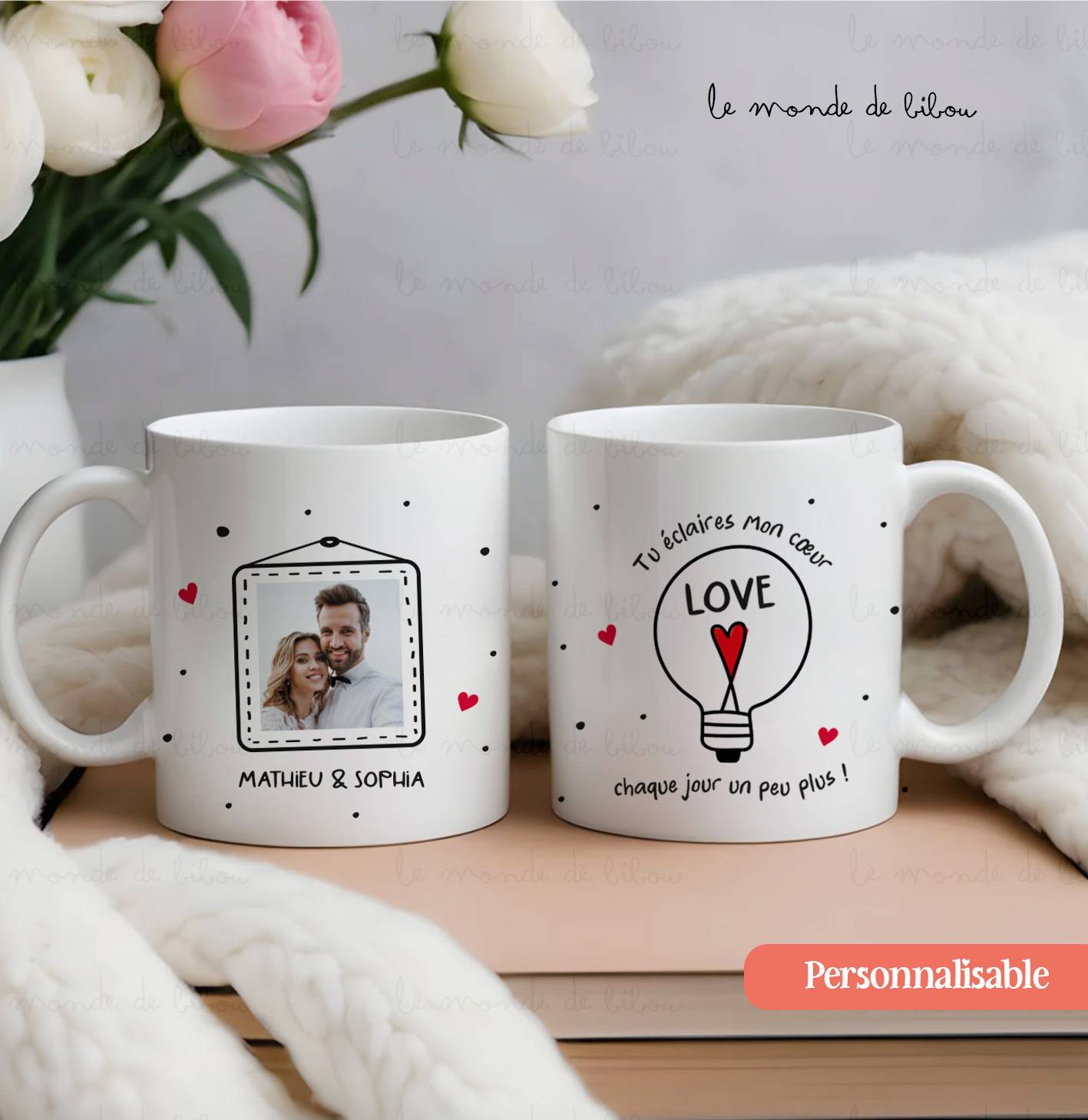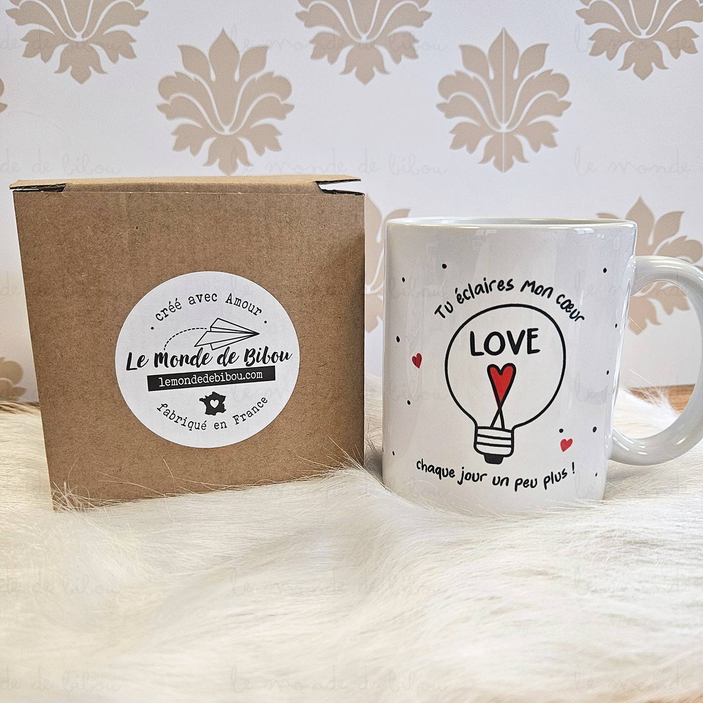 Le recto du mug affiche une magnifique illustration réalisée à la main : une ampoule lumineuse contenant un cœur, accompagnée de la phrase délicate : « Tu éclaires ma vie chaque jour un peu plus ». Ce message poétique est parfait pour transmettre votre amour et votre gratitude.