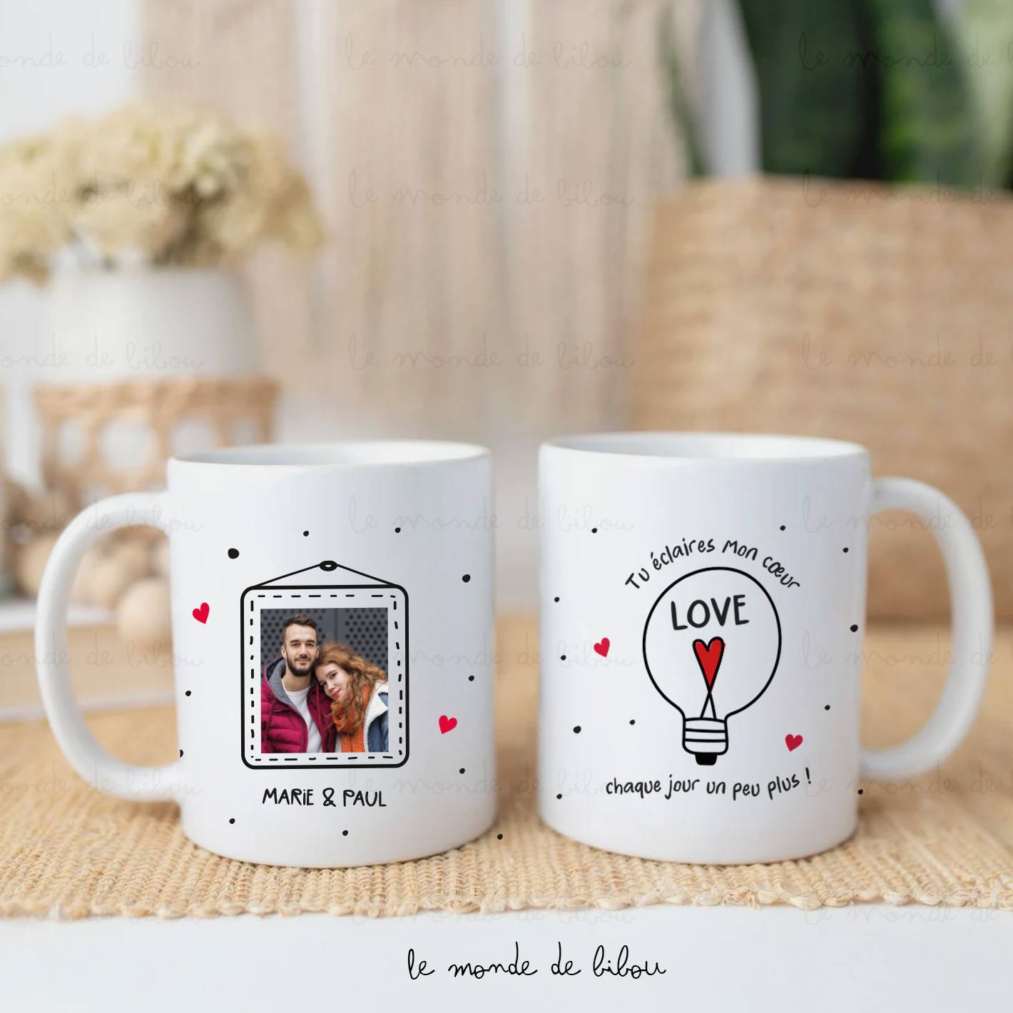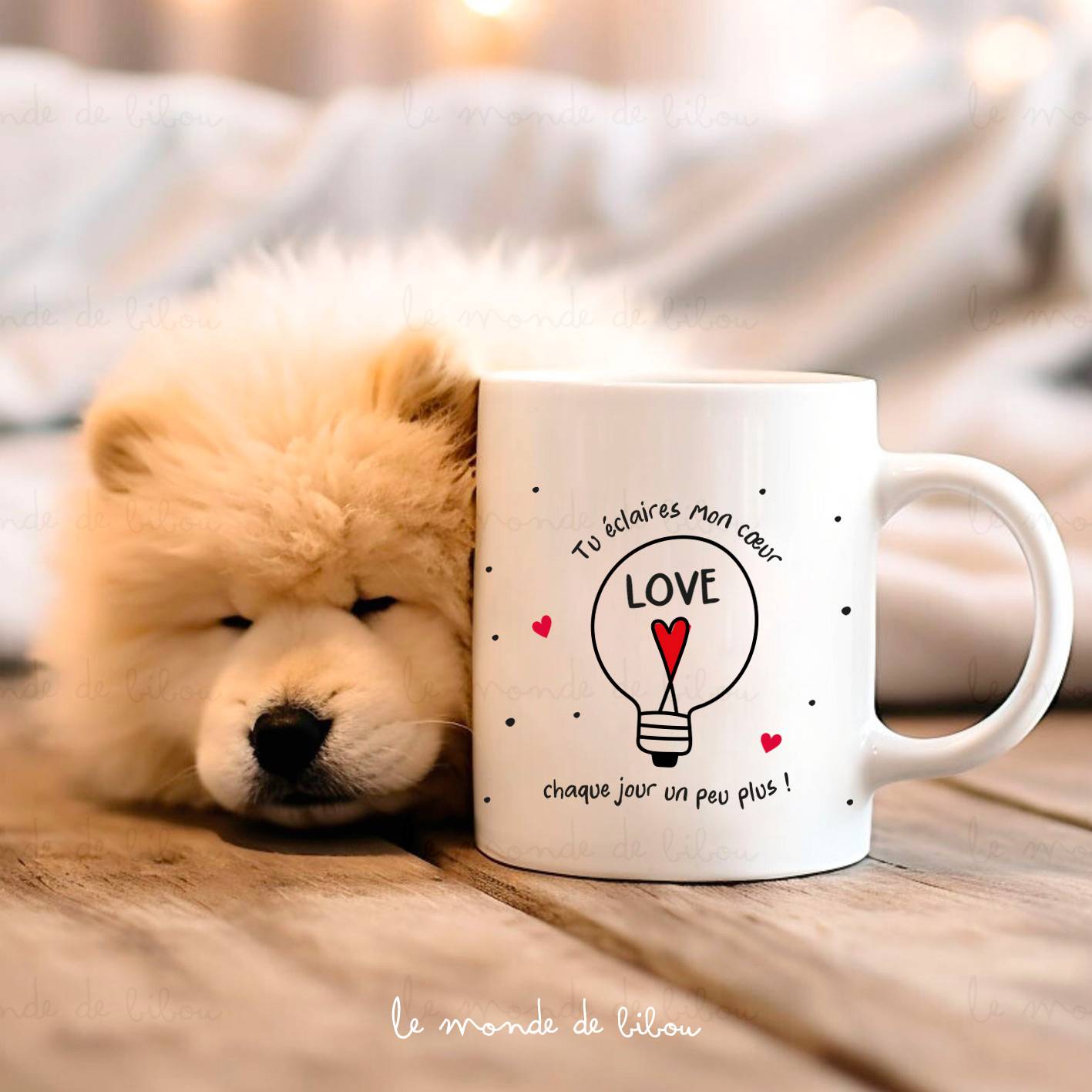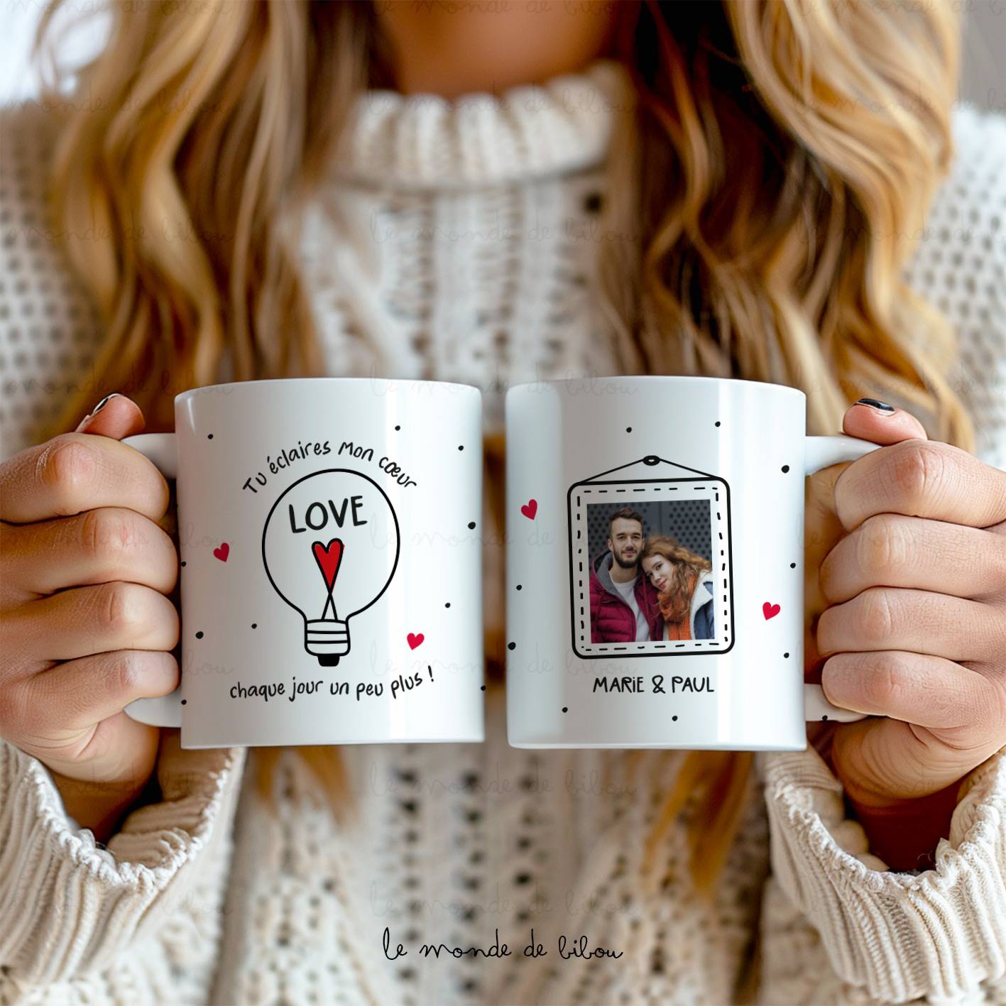 Le recto du mug affiche une magnifique illustration réalisée à la main : une ampoule lumineuse contenant un cœur, accompagnée de la phrase délicate : « Tu éclaires ma vie chaque jour un peu plus ». Ce message poétique est parfait pour transmettre votre amour et votre gratitude.