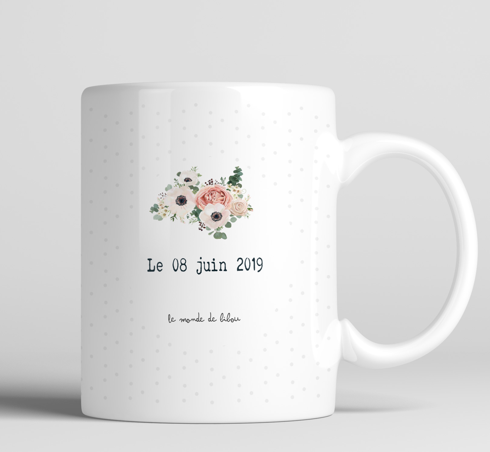 Parce que les témoins sont là pour témoigner de l’amour entre les futurs époux. Le Mug personnalisé Témoin de la mariée est une jolie façon de remercier votre témoin de mariage. C’est une attention aussi bien touchante qu’utile à offrir le jour J. Cette tasse personnalisable à son prénom et à la date du mariage plaira à coup sûr à celle qui sera à vos côtés en cette heureuse journée. Vous aurez ainsi la joie d’offrir un chouette cadeau romantique avec son charmant bouquet de fleurs blanches aux touches de roses sur un discret fond à petits pois. Le prénom de votre témoin est imprimé en blanc sur une banderole jaune.