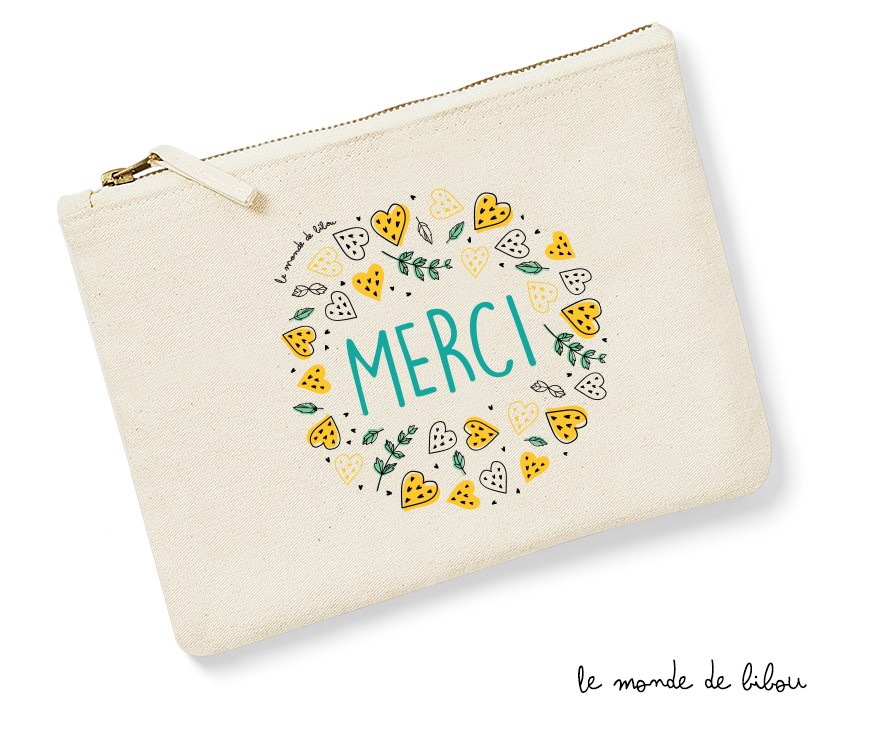 Vous souhaitez offrir un petit cadeau aussi joli qu’utile ? Nous vous proposons cette jolie Pochette cadeau Merci en coton naturel. Cette trousse est multi-usage (trousse à crayons, à maquillage, à bazar… ). On l’adore ce joli cadeau pour la nounou, l’atsem ou la maîtresse de votre enfant ! Idéal à l’occasion d’un anniversaire, comme cadeau de Noël ou comme cadeau de fin d’année scolaire… Cette pochette ne pourra que faire plaisir à la personne qui va la recevoir.
