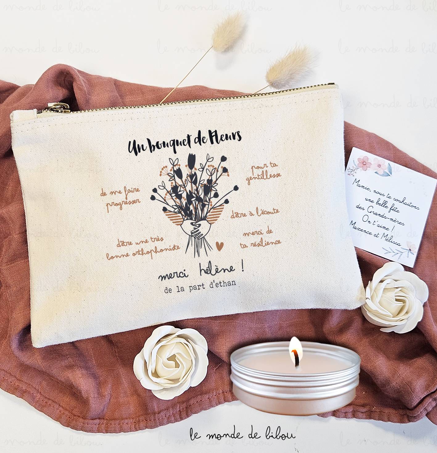 Notre duo Pochette et Bougie Bouquet de fleurs Remerciement vous plaît ? Retrouvez nos cadeaux personnalisés pour Maîtresse, Maître, Atsem, AVS ou Nounou dans la boutique Le Monde de Bibou.