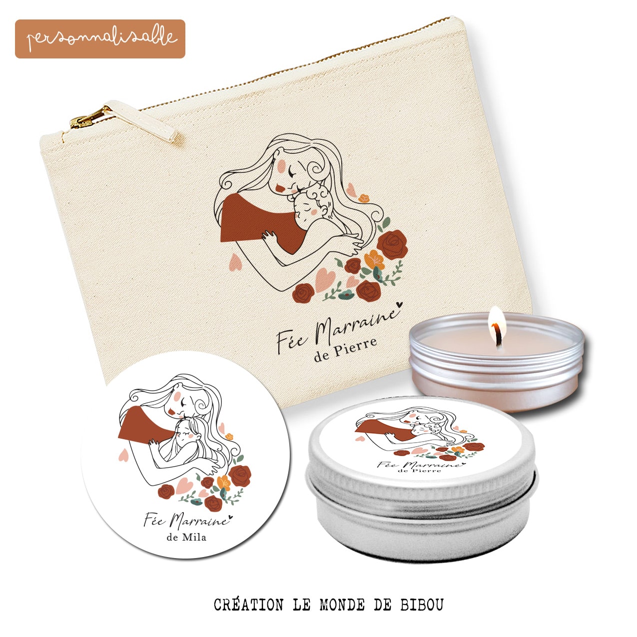 Le Kit cadeau, pochette et bougie parfumée pour Fée Marraines un cadeau pour gâter la marraine de votre enfant ! Nous vous proposons cette jolie pochette accompagnée de sa bougie parfumée. Une belle idée de cadeau à offrir à toutes les marraines. C’est le présent idéal pour un anniversaire, un Baptême, les fêtes de fin d’année ou juste pour faire plaisir…