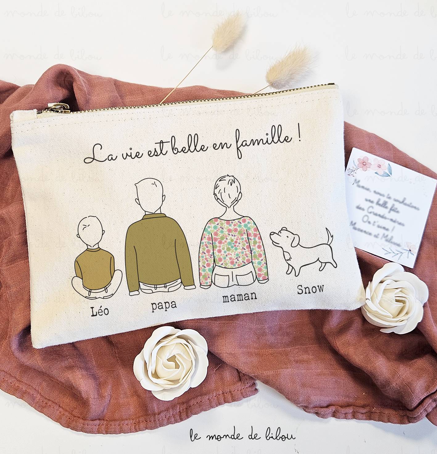 Voici une adorable collection « La vie est belle en famille ». Cette collection est une exclusivité le Monde de Bibou. Nos illustrations sont des créations uniques. Personnalisez la Pochette La vie est belle en Famille avec les membres de la vôtre : ajoutez vos enfants, votre chien et indiquez leur prénom.