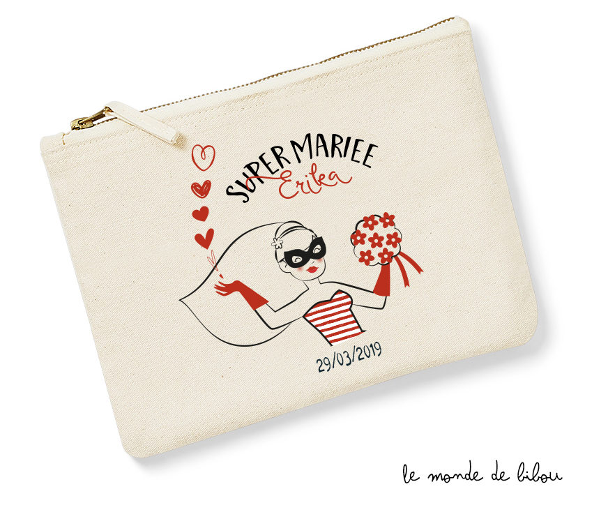 Cette Pochette Mariée Super Héros personnalisée pour jeune ou future mariée est une chouette idée de cadeau à offrir à celle-ci lors de son EVJF (Enterrement de Vie de Jeune Fille) ou de son mariage. Un cadeau personnalisé à son prénom qui permettra de garder un joli souvenir de cet événement heureux !