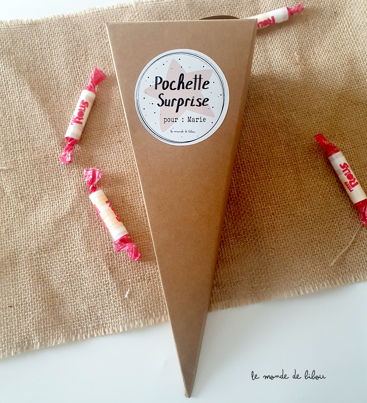- Texte recto : « Pochette surprise – Pour Prénom de la future mariée »