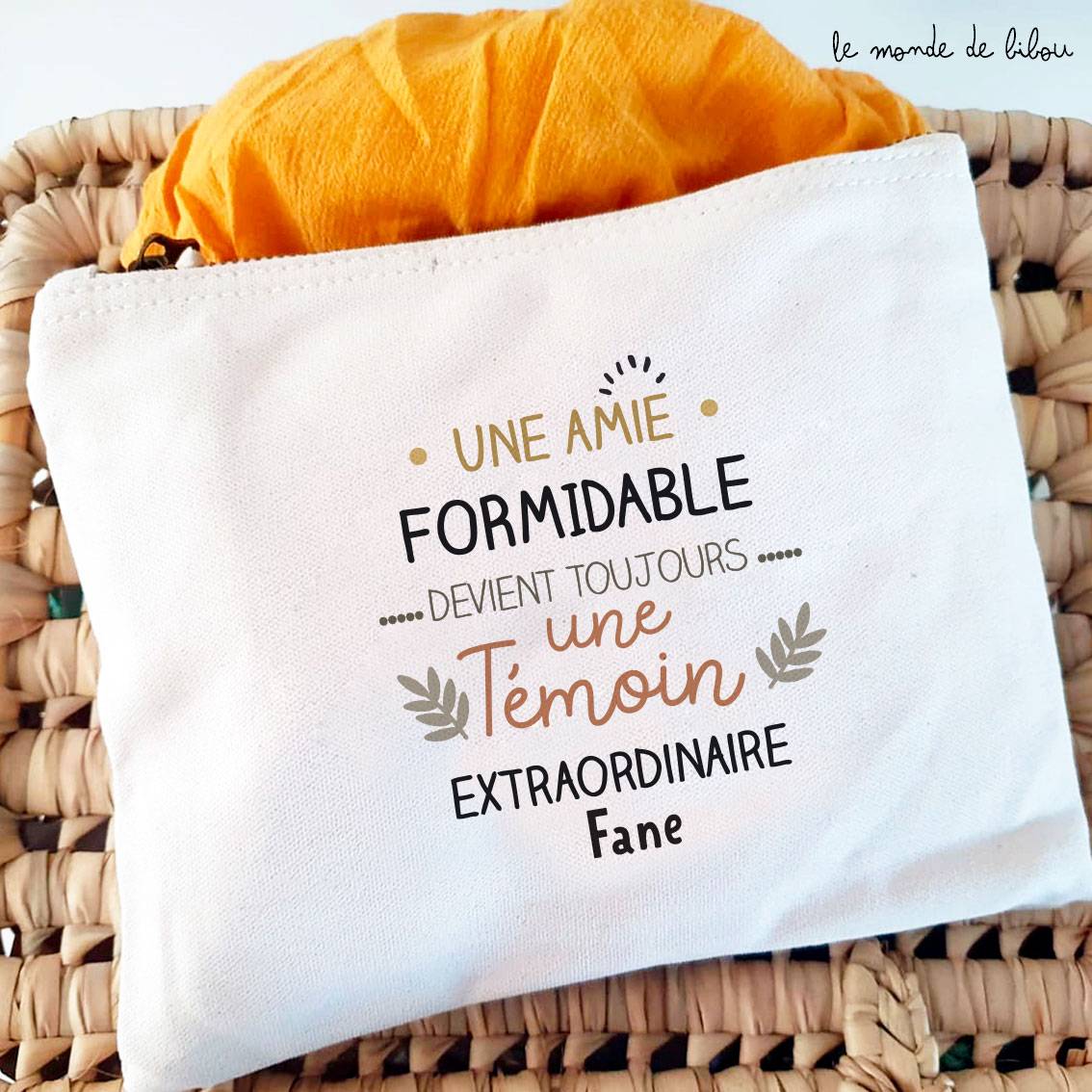 Cette jolie trousse pour remercier votre super témoin est un cadeau personnalisable. La pochette, personnalisée au prénom de la témoin et à la date du mariage ou d’ EVJF, permettra de garder un joli souvenir de cet événement heureux. Elle trouvera rapidement une place dans sa salle de bain ou dans son sac à main !