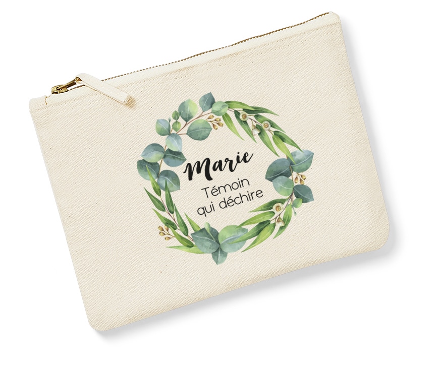 Le petit cadeau idéal à offrir à sa témoin lors de votre mariage ou lors de votre EVJF. On adore cette petite pochette multi-usage au style bucolique et bohème avec sa couronne d’eucalyptus aux tons verts et bleus, une valeur sûre pour faire plaisir à la personne qui la recevra.