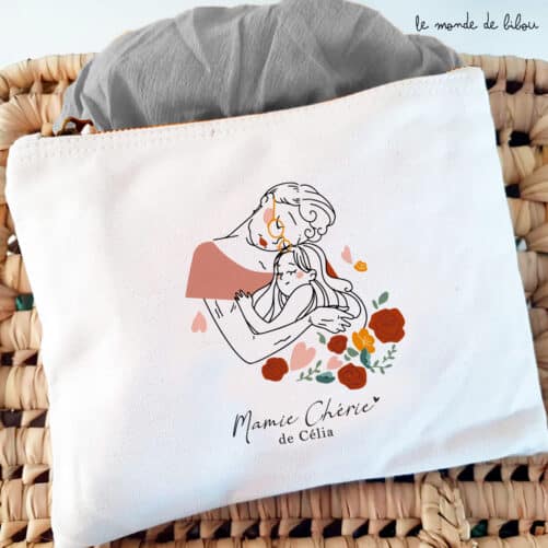 Une jolie Pochette Trousse Mamie chérie personnalisée à offrir à votre Mamie chérie. Un chouette cadeau pour dire à sa grand-mère combien on l’aime. L’attention idéale, aussi jolie qu’utile, à offrir lors d’un anniversaire, pour célébrer la fête des grand-mères ou lors des fêtes de Noël.