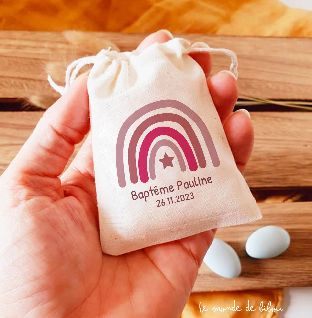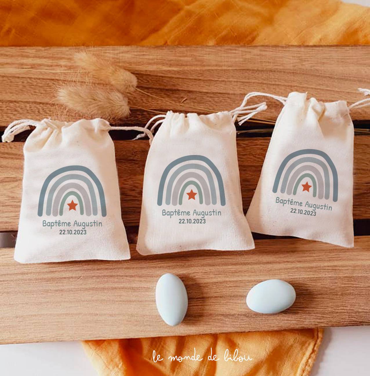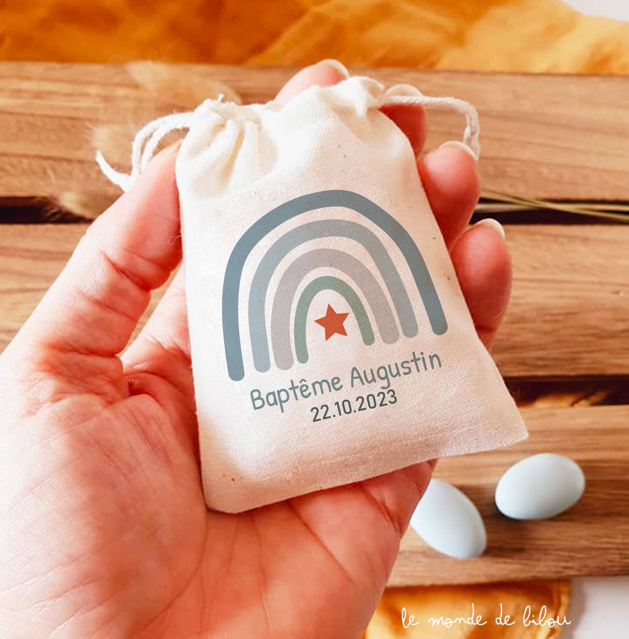 Nos Pochon dragées personnalisé arc en ciel sont le cadeau invité idéal pour tous vos événements heureux aussi bien pour un Baptême, une Communion, une Profession de Foi ou encore une Naissance.