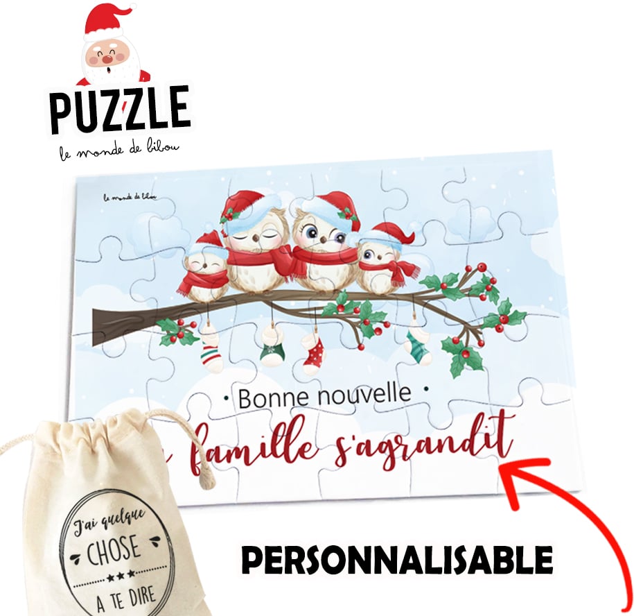 Un joli Puzzle de Noël Bonne nouvelle personnalisé spécialement imaginé pour la période de Noël. Il est accompagné de son petit sac de rangement. Votre puzzle est personnalisable avec VOTRE texte ! Une chouette idée de cadeau à offrir pour annoncer une bonne nouvelle que ce soit une naissance à venir, un mariage en vue, un déménagement ou même un départ en retraite…